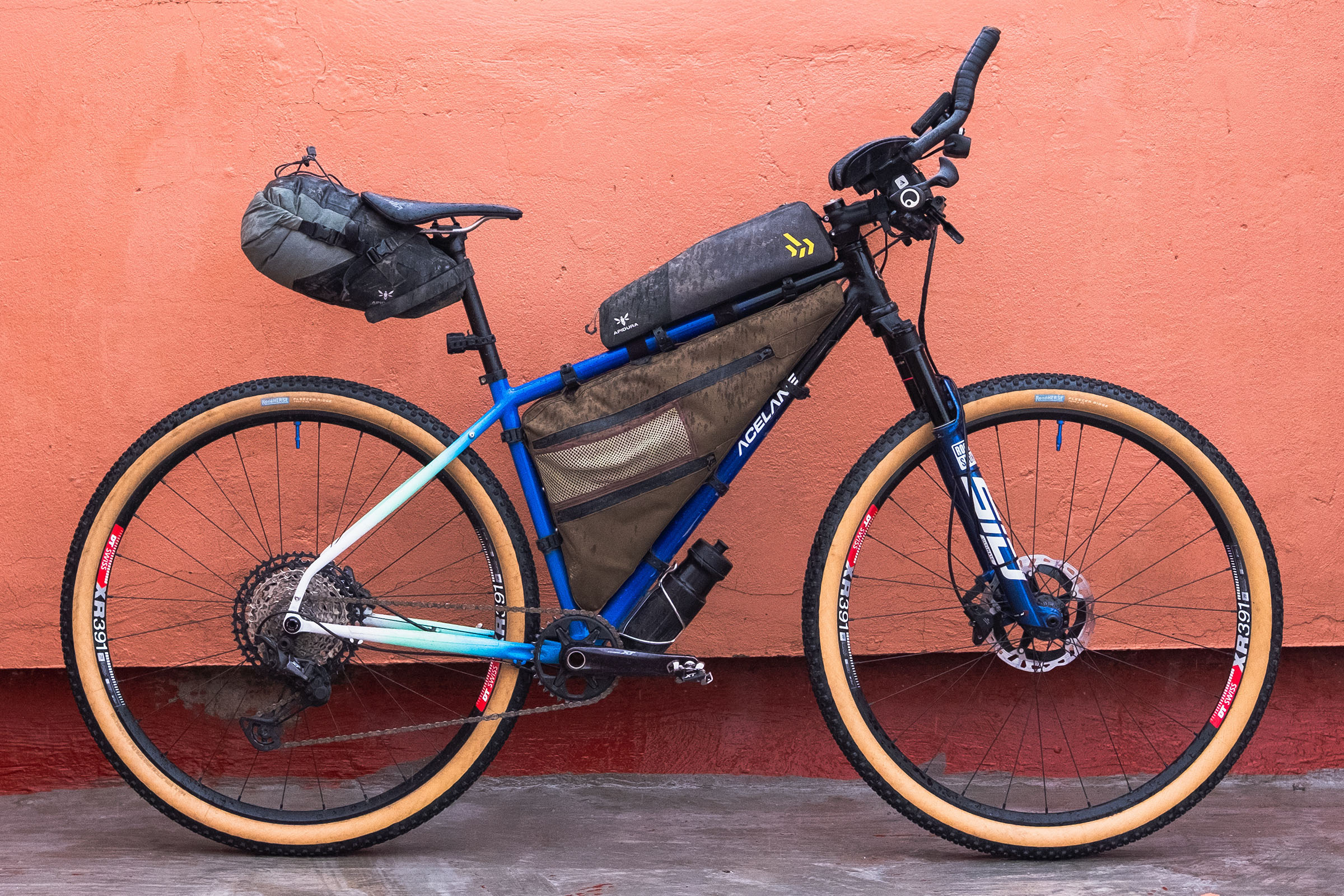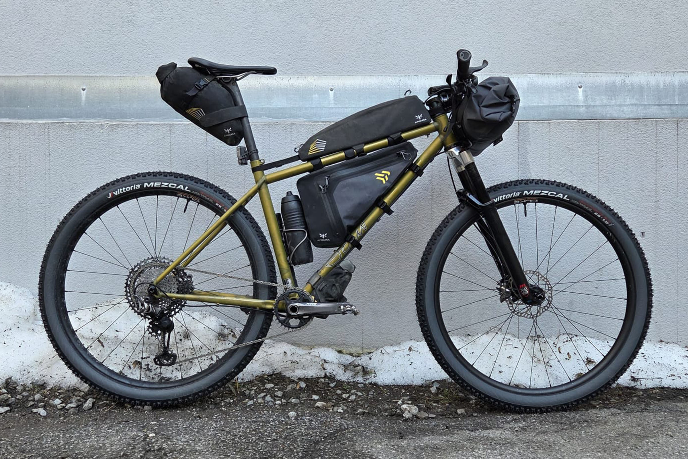 BAGS: Rear and in-triangle bags from Triglav Works, an on-frame Tailfin, two bottle cages from Decathlon, and a front roll bag from Decathlon (bag only).