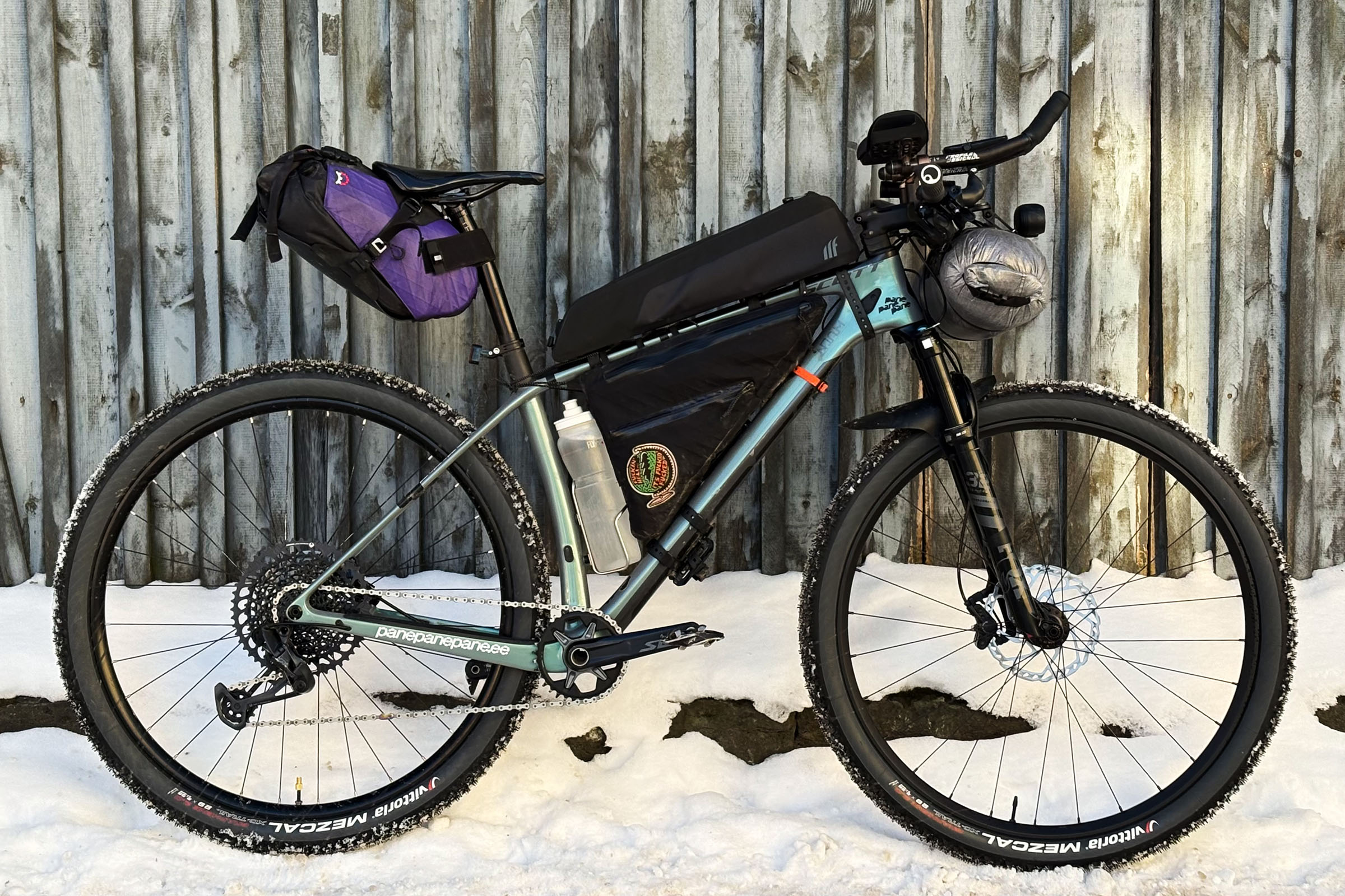 BAGS: Pretty much all Tailfin generously loaned to me by my wife, Mel. Aeropack in the rear with my sleep kit and warm clothes, 1.6L Long Top Tube Bag in the middle for electronics and food, a Rear Top Tube bag (the 0.9L road one fits perfectly) for quick access layers, and a Downtube Pack for spares and tools.
