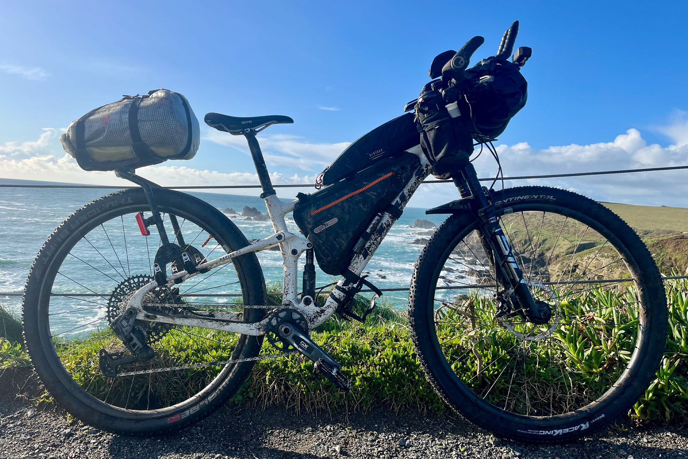 BAGS: 7L saddle bag, 4L frame bag, 2L top tube all from Apidura. Tailfin bar cage with drybag for the sleeping gear. Hydration vest for water and extra bits.