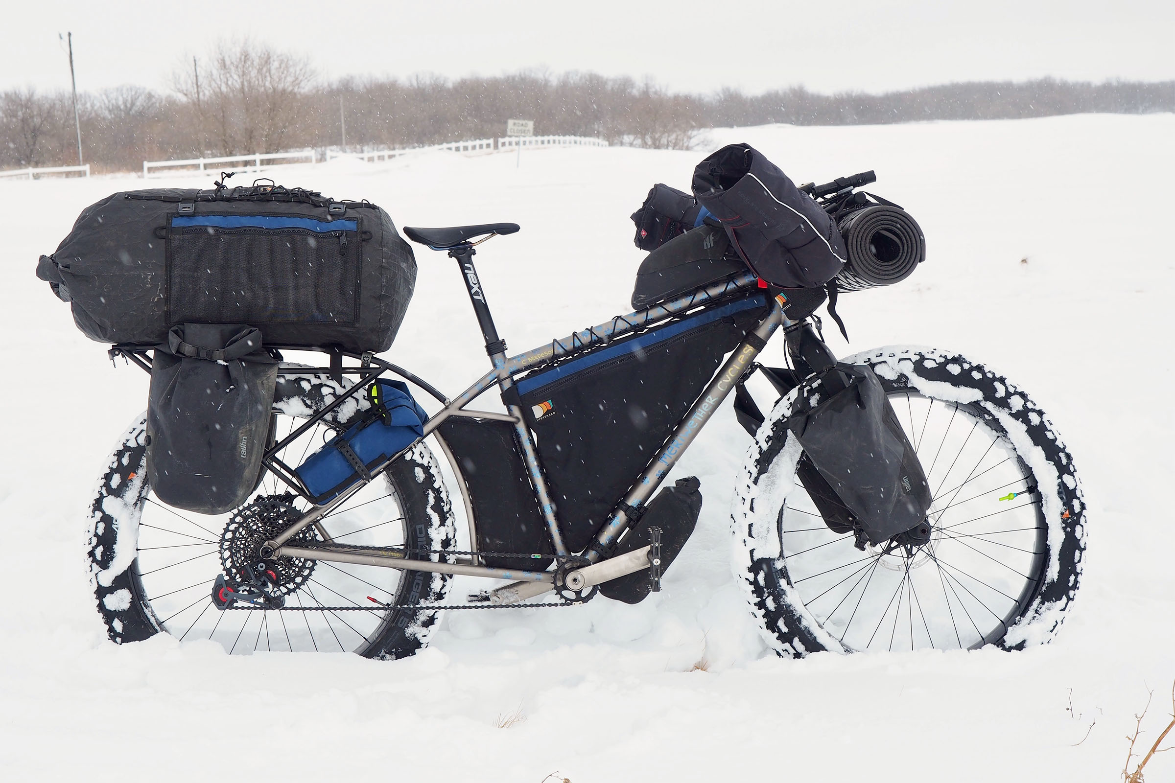 BAGS: Revelate Designs panniers and feed bags, Apocalypse Design frame bag, and pogies.