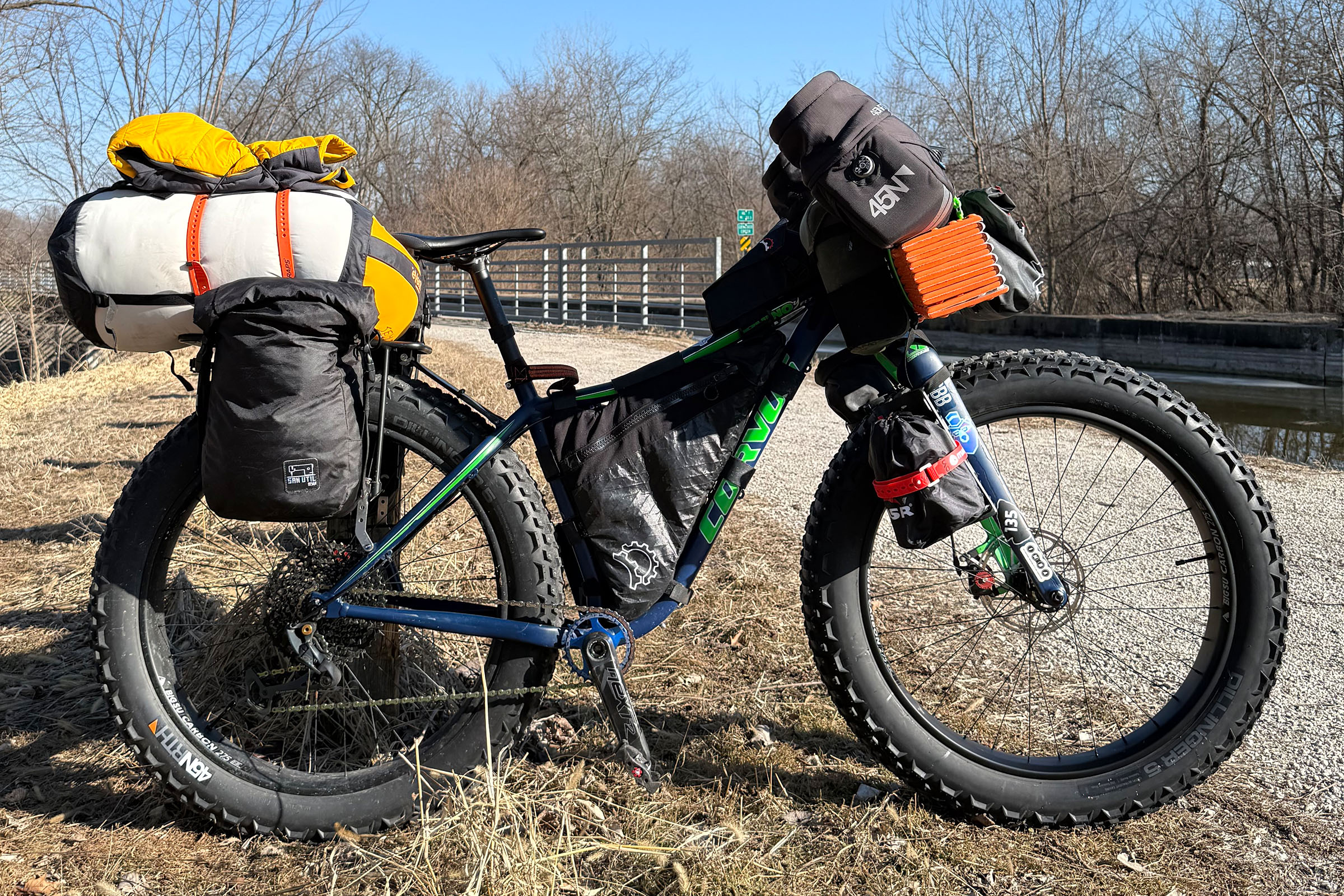BIKE: Borealis Crestone with SRAM GX on a Garbaruk cassette, driving a set of Dillinger 5 tires. Old Man Mountain Fat Divide Rear rack and a BarYak Expedition 35 to keep the handlebar bags solidly.