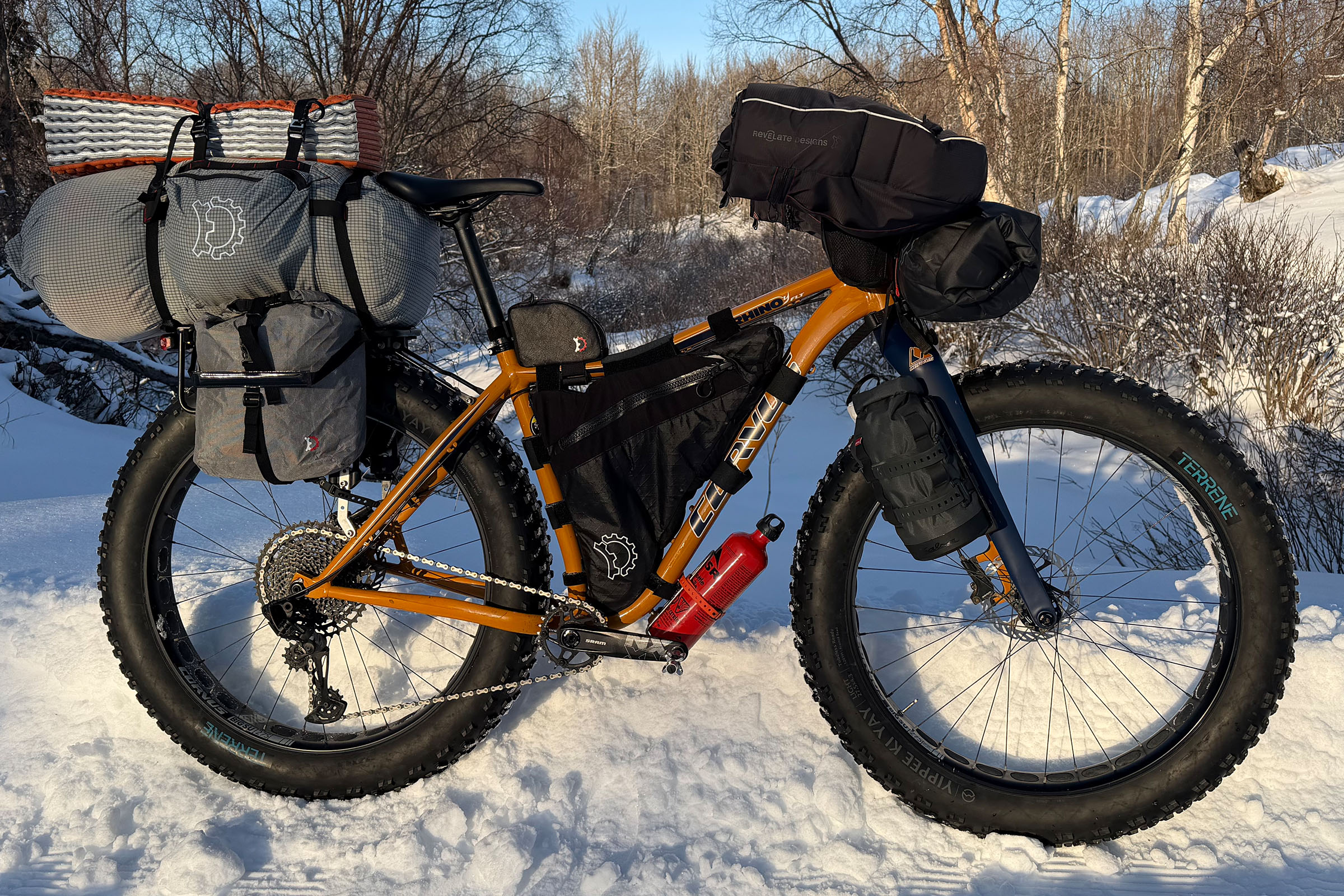 BAGS: I run a variety of bags, including an Old Man Mountain Divide XL Rack, Ortlieb Panniers, and a handlebar pack. I use a Ride Forward Designs Chillin’ sleep system bag, a Cedaero frame bag, Salsa Anything Cage bags, Revelate Designs Expedition Pogies, Mountain Feedbags, a Joey Downtube Bag, and a MagTank.