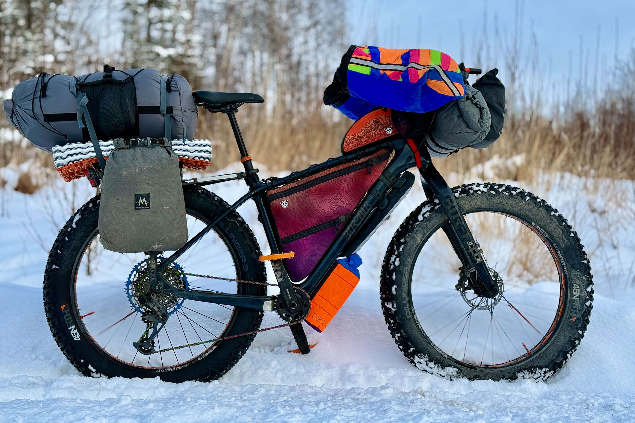 BAGS: Custom Loam Equipment frame bag, Revelate Designs Nano Panniers, Sea to Summit 36L compression sack for all puffy storage, multiple Revelate snack bags, handlebar pouch, unknown make, generously borrowed from Janice Tower.