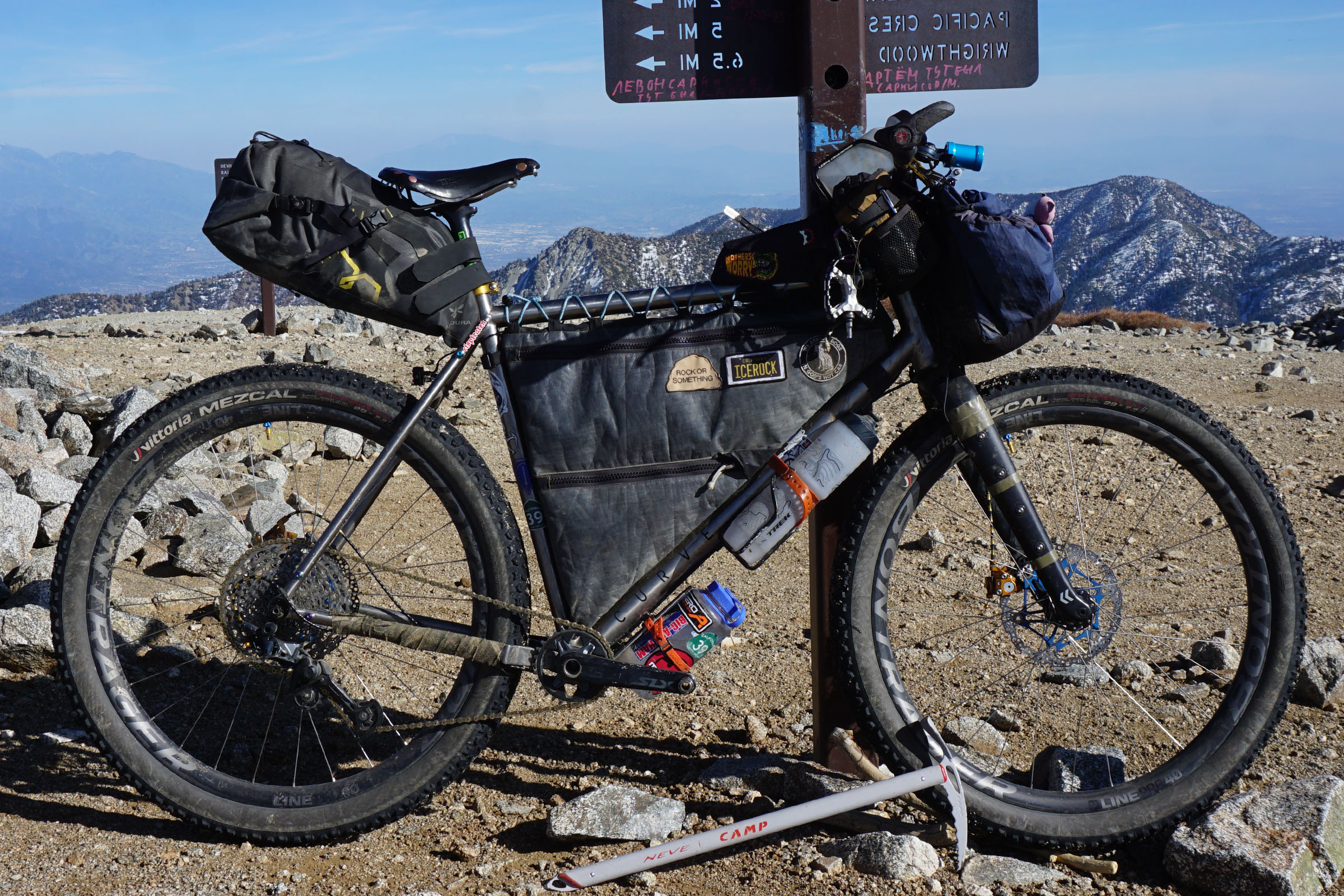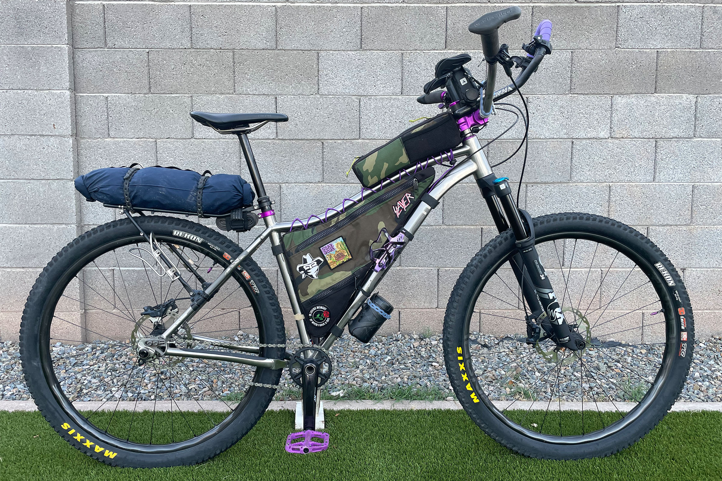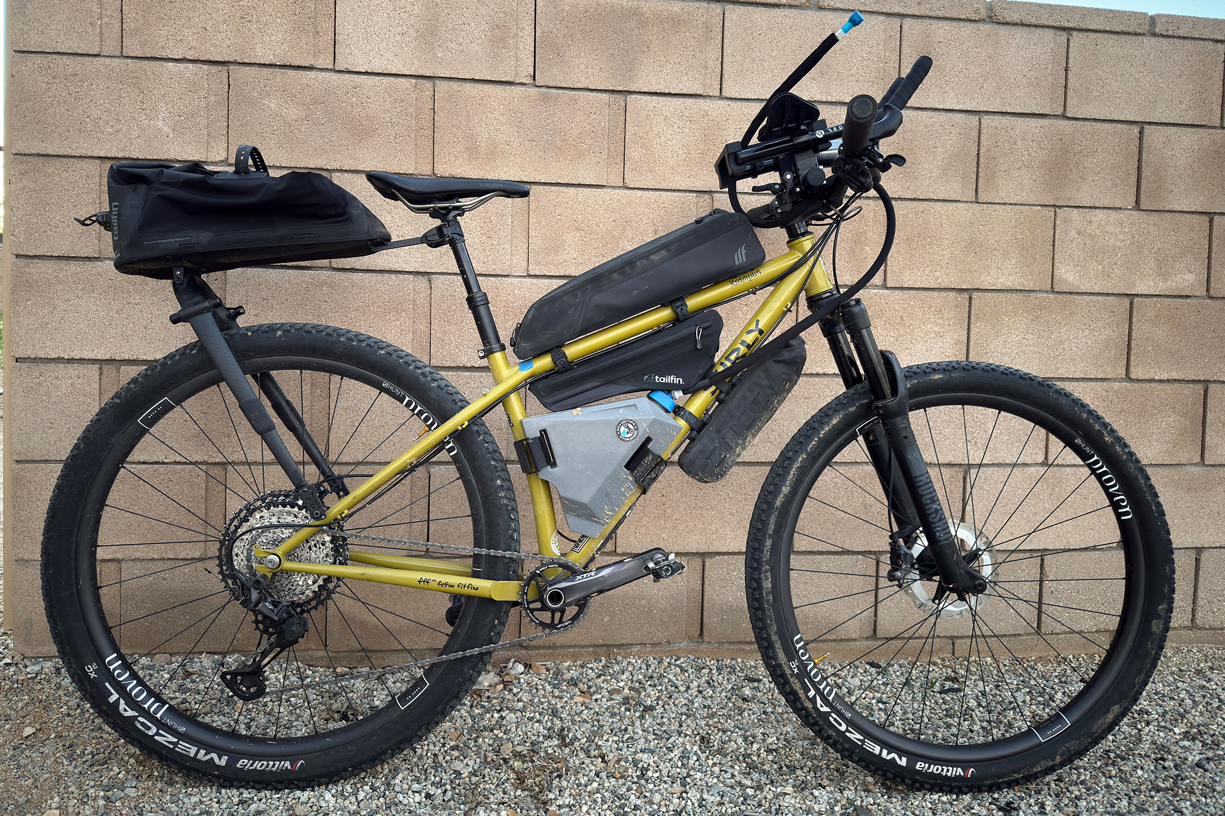 GEAR HIGHLIGHTS: Dispersed top tube bag always surprises me with how many snacks it can hold, a modified Tumbleweed T-rack to get the dry bag lower and out of the way of the dropper with Widefoot cages to carry extra water for the desert.