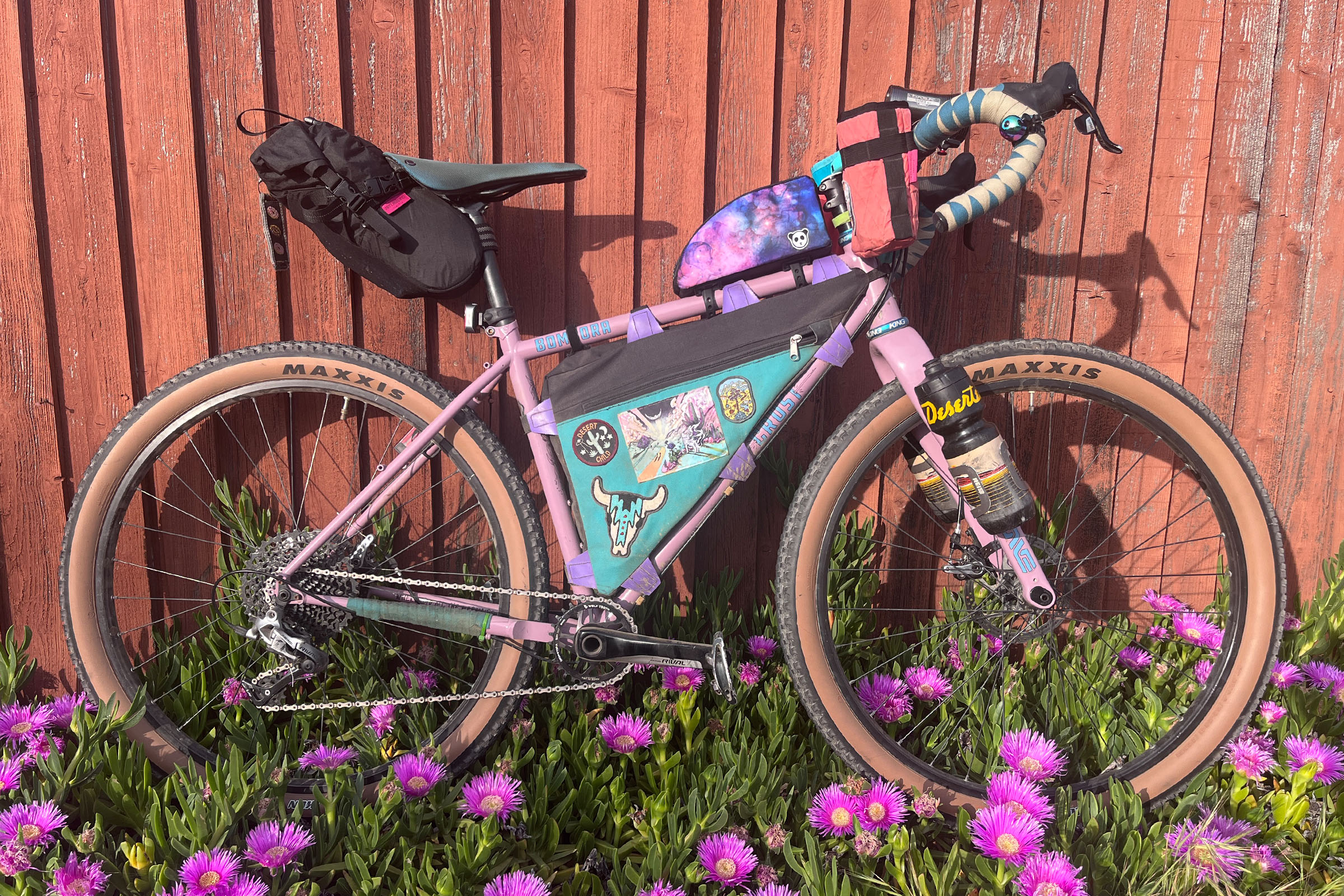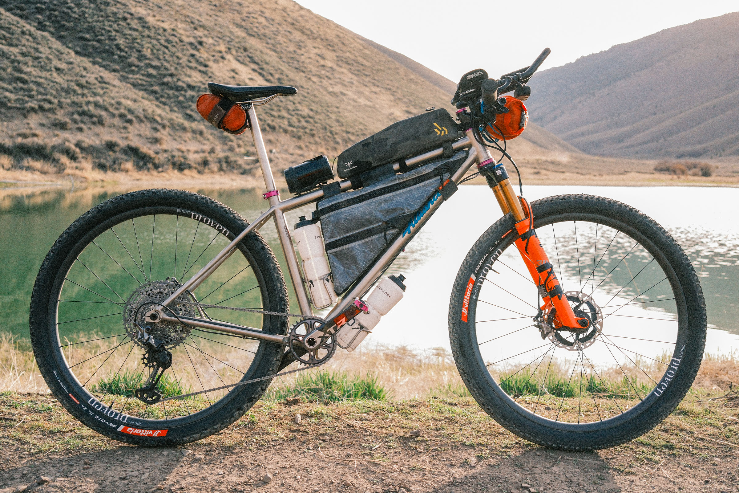 BAGS: Rogue Panda Ripsey seat bag. This bag is amazing on XS bikes. I still can use my dropper post and get about 75mm drop, which is amazing. Rogue Panda frame bag and full-length top tube bag. Revelate Designs feed bags and Pronghorn handlebar harness.