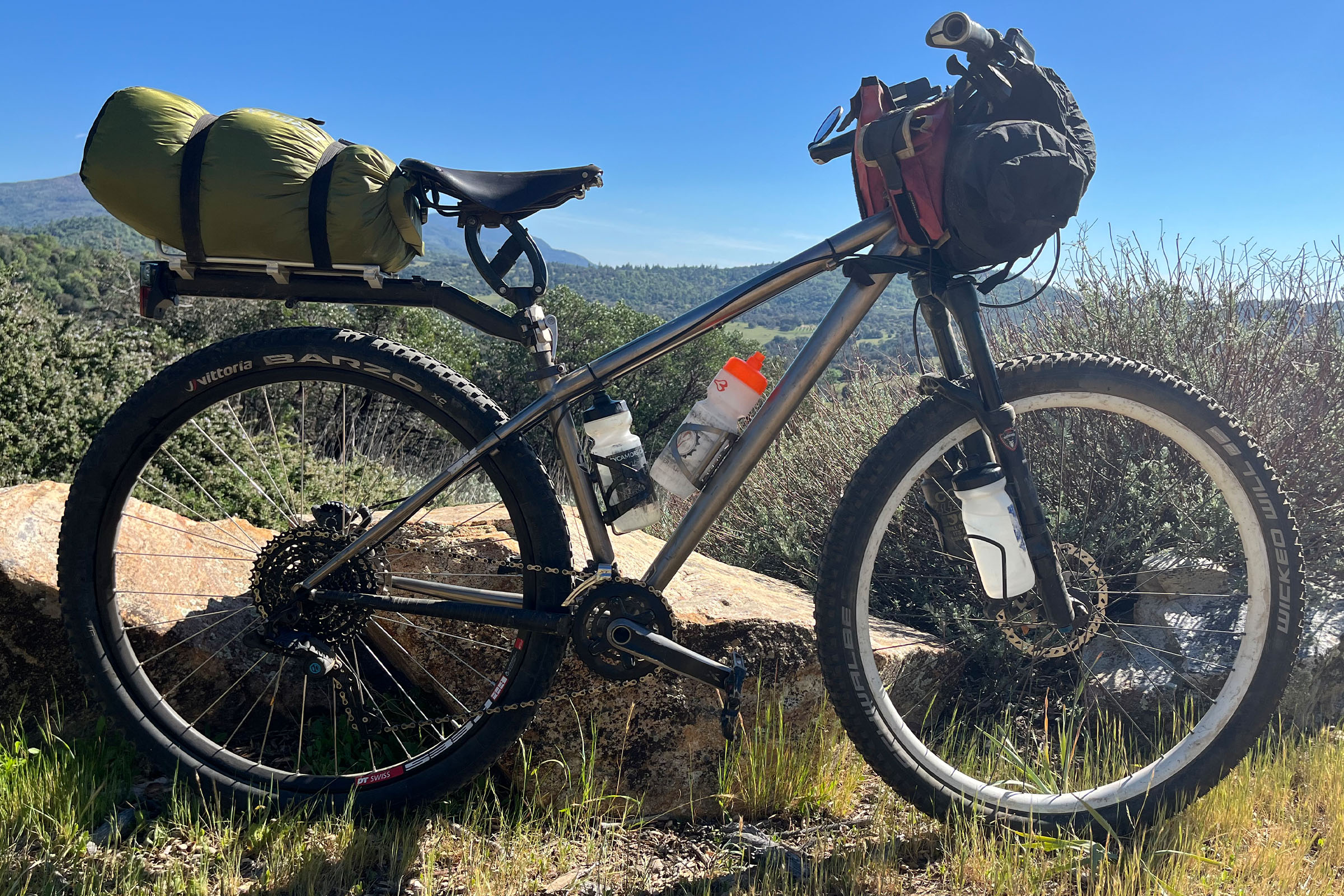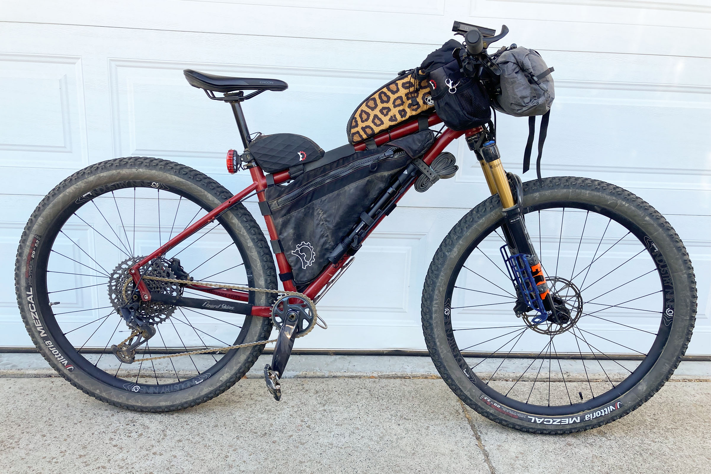 BAGS: Revelate Designs frame bag, feed bags, jerrycan. Rogue Panda top tube bag, Blue Ridge handlebar harness with MLD bag.