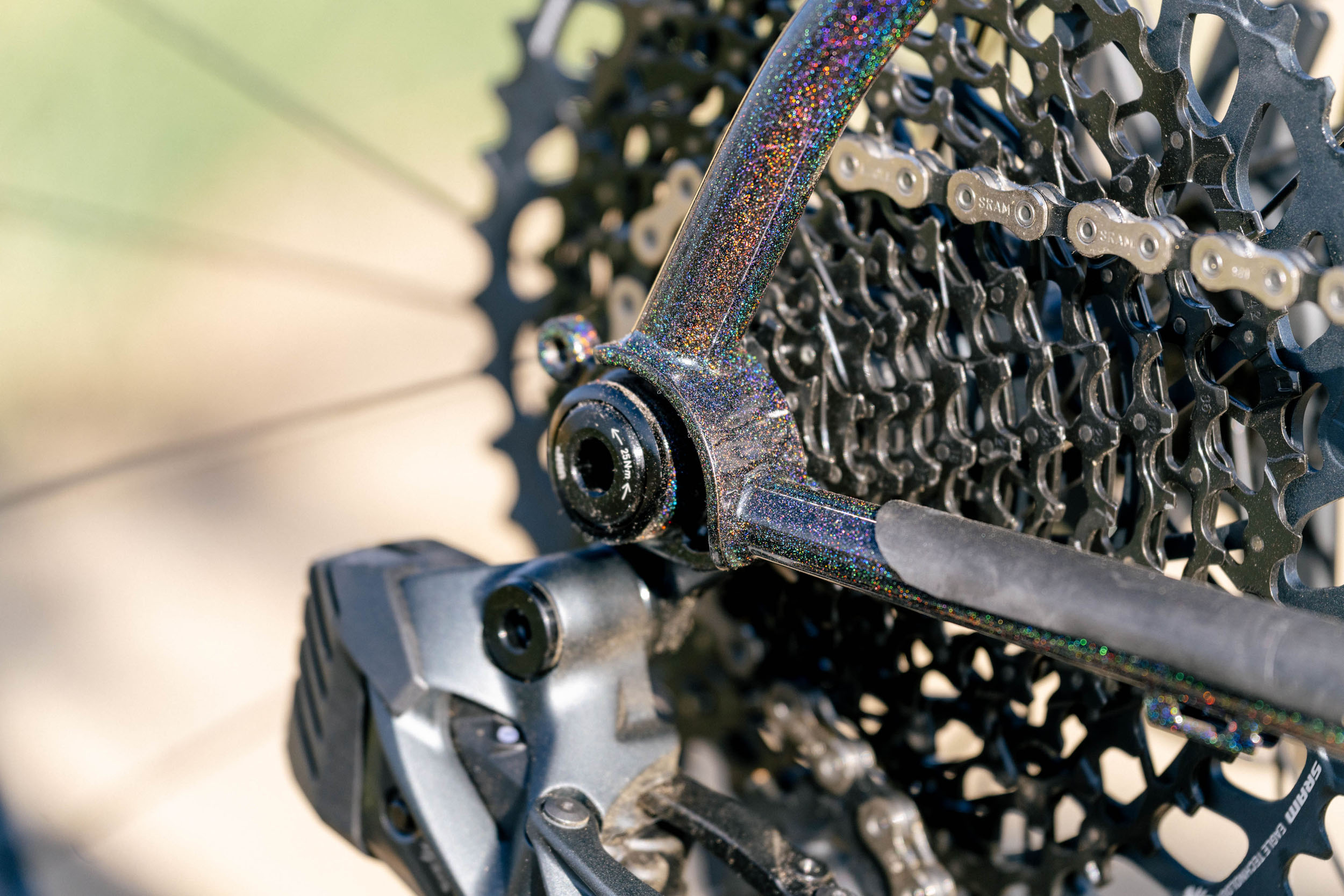 The chassis is built around a 420mm axle-to-crown to accommodate modern gravel suspension forks. Updates include a fixed UDH dropout, 44mm head tube, 68mm threaded BB, 142×12mm rear spacing, flat-mount brakes, internal dropper routing, and external brake/shifter routing. It takes a 27.2mm seatpost, clears up to 2.2″ tires, is 1x-specific with a max 42T ring, and—like most REEBs—comes in six sharp color options. The Ka-Chow finish I tested looks understated until the light hits it; then the subtle sparkle pops. I love it.
