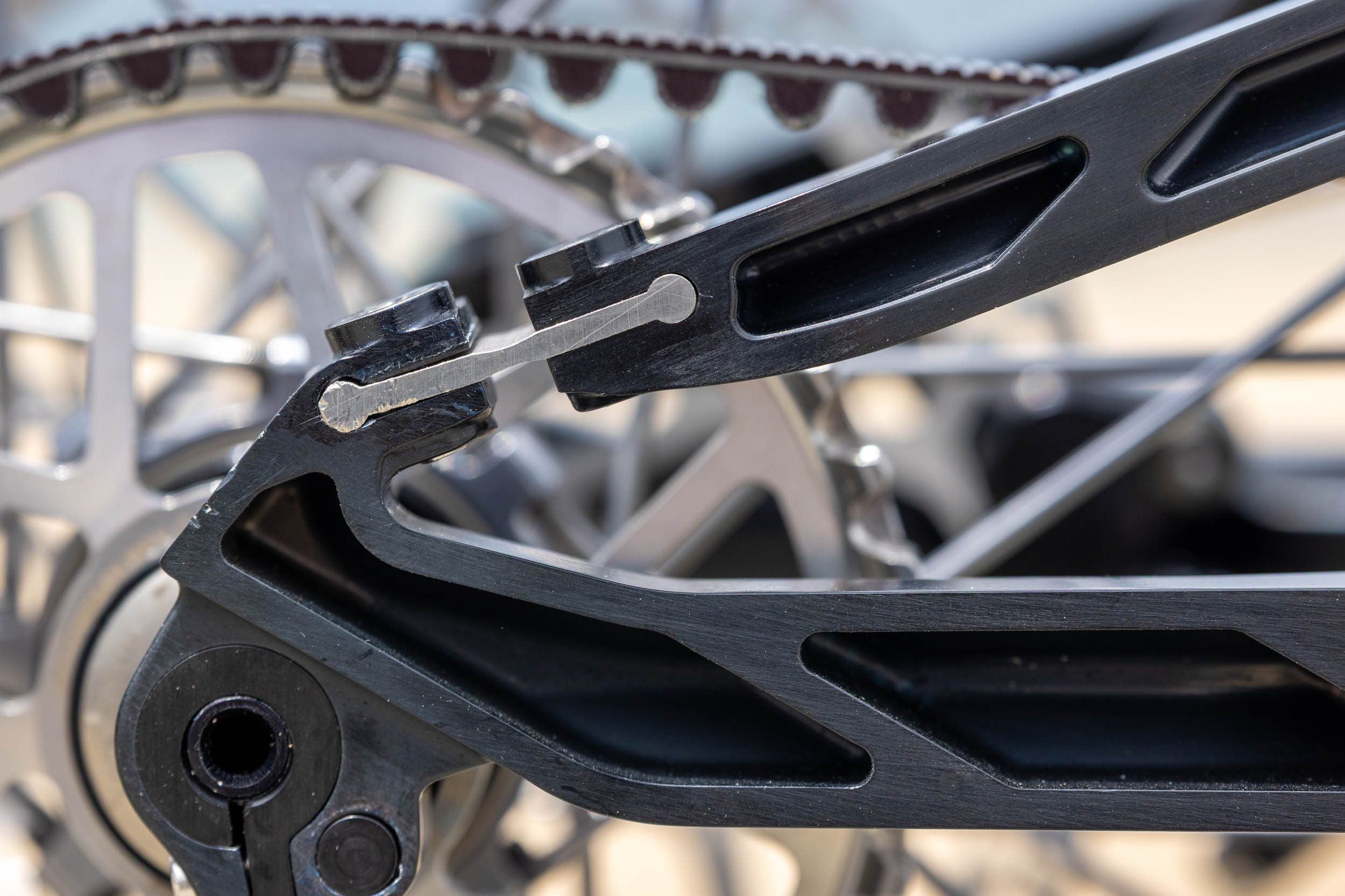 The seat stays are joined by a titanium flex plate, positioned to achieve the ride quality Steve was after. The flex plate bolts into place, providing a passage for the Pinion’s belt and allowing Steve to adjust the thickness, stiffness, and flex as needed. The plate is keyed so that the pivot is isolated to up/down movement, and there is no torsional flex with the design. Steve explained, “Titanium can almost be infinitely flexed in this use case without loss of strength, so it’s the perfect flexation material.”
