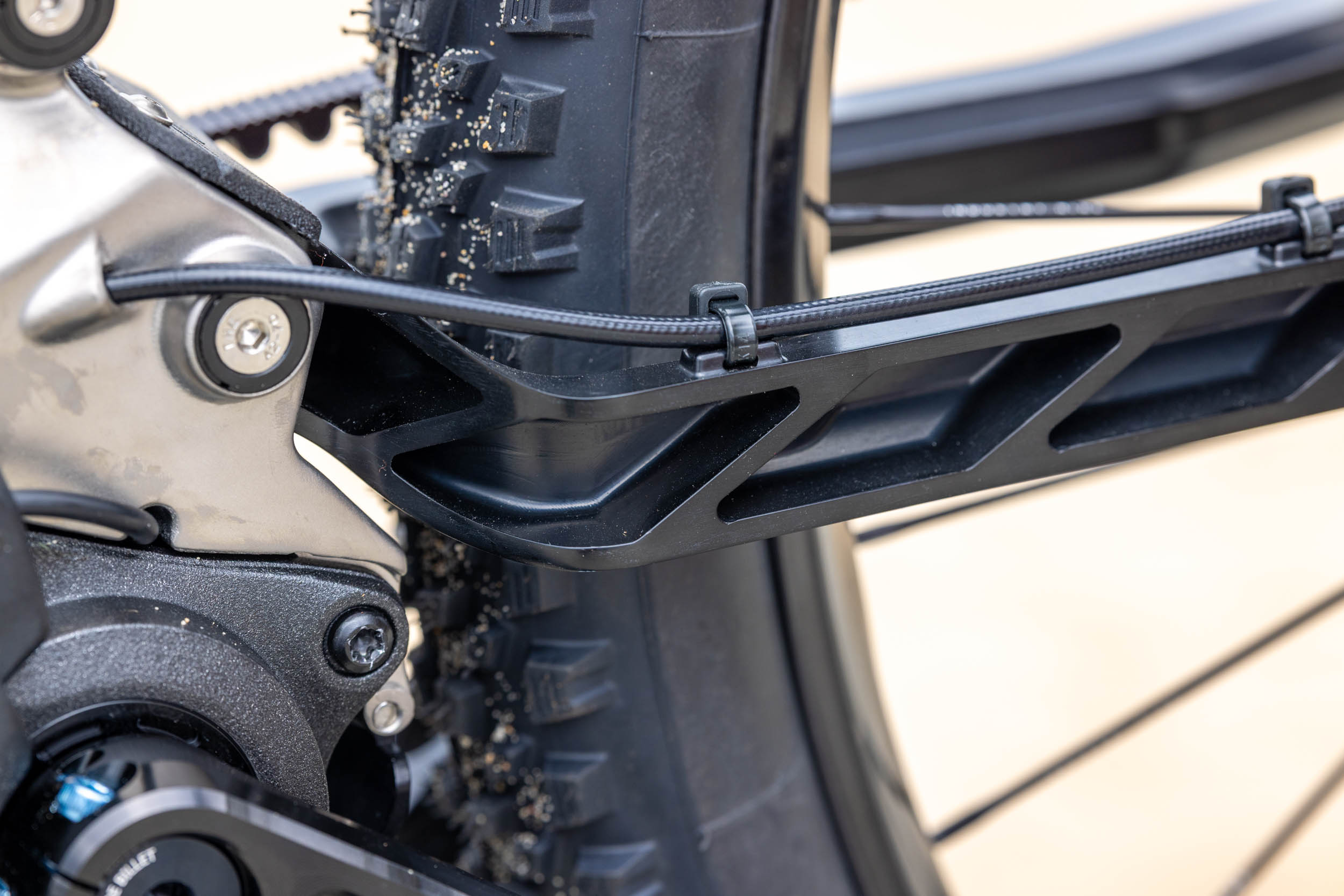 Optimist 145 features a full-titanium front triangle with 3D-printed lugs welded to titanium tubes, which Steve says offer incredible damping. The rear triangle is made from fully CNC-machined alloy. The machined cutouts face outward, which not only shows off the construction but, as Steve explained, makes it easier to clean compared to having them face inward toward the tire.