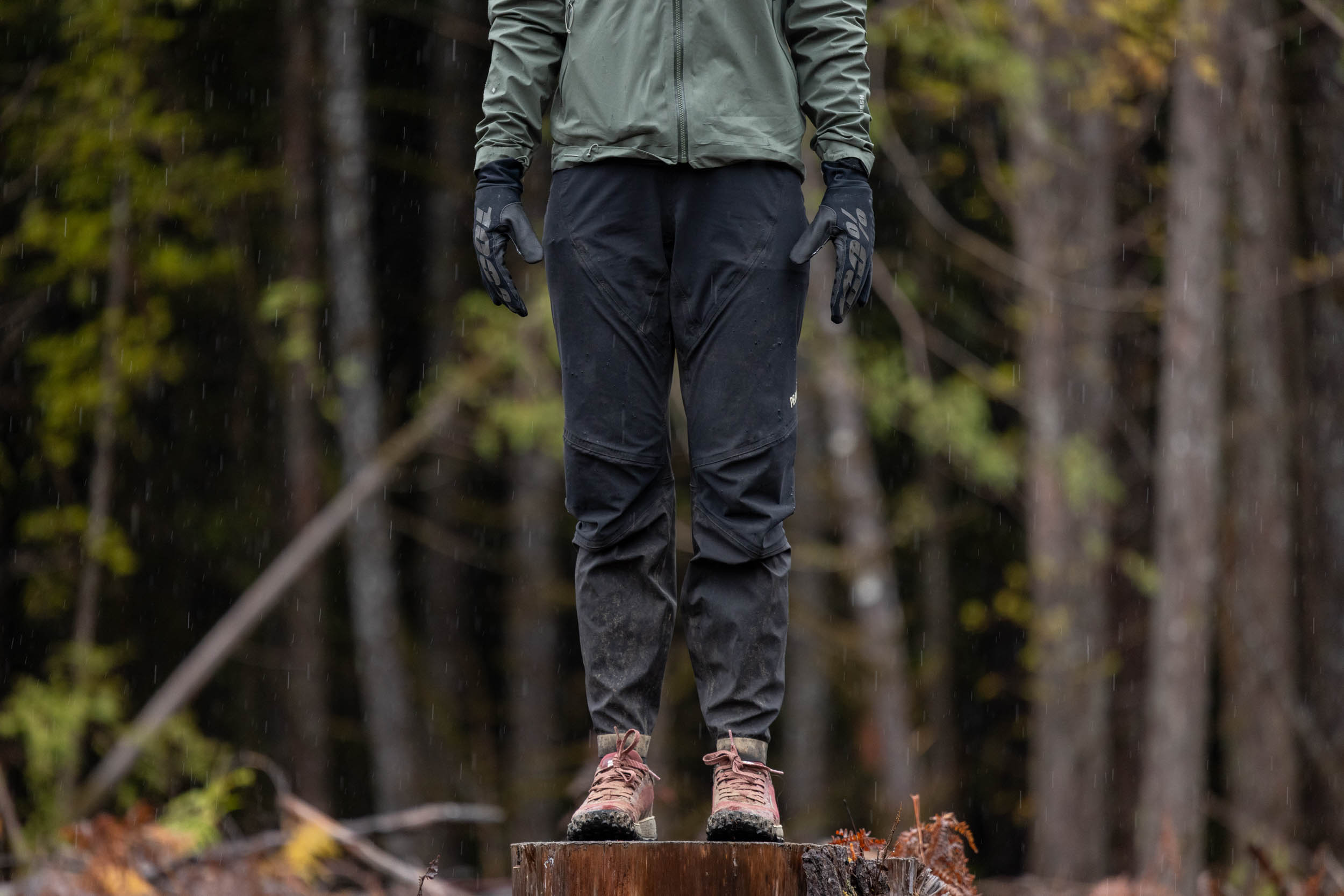 The Cinder Kinetic Waterproof Biking Pants feature ankle zippers, a raised center back for better coverage while riding, a shock-cord waist adjustment, two zippered pockets, and two small zippered thigh vents. Those considering the environment will be pleased to know that it’s made from Fluorocarbon (PFAS)- free fabrics and contains over 27% recycled materials, with the face and backer fabric being 100% recycled. Some clever details, like offset seams and hem reinforcements, should add to the pants’ lifespan, and so far, they show no signs of early wear. If you’re wondering why they don’t look very wet in these photos, it’s because their impressive breathability and less-than-ideal waterproof rating make them ideal as a cold-weather soft-shell pant, rather than a go-to rain pant. They’d probably make a fantastic fat-biking or winter-cycling pant in a climate that sees more snow and less rain than the Pacific Northwest.