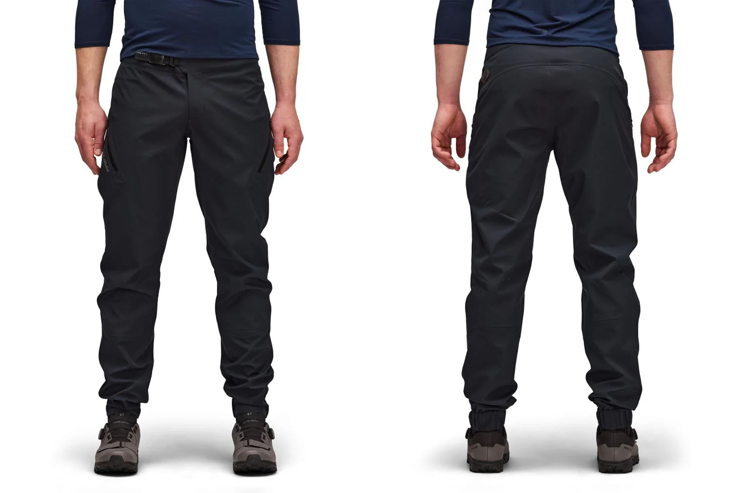 The Rapha Trail Gore-Tex Pants are some of the burliest pants I tested. They are mountain-biking pants through and through, with extra room around the knees for pads, more reinforcements, a generously sized waistband, webbing waist cinch straps, and a fly zipper and a nifty sliding fly button. They have a reinforced seat panel, legs, and in-step. Some details, including rivets around the front pockets, make them appear more casual than the other pants we tested. There are two front pockets and elasticized ankles, but they are otherwise quite minimal. Unlike most of the other pants, the Rapha Trail GORE-TEX Pants don’t have ankle zippers for easy removal, so they are best reserved for conditions where they’ll be on for long periods.