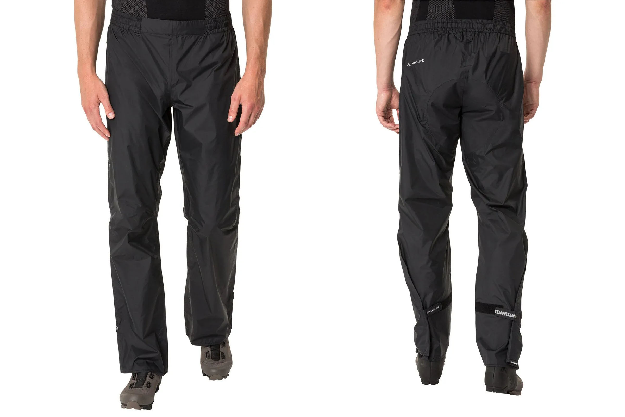 The Vaude Drop II Rain Pants are another popular budget option that some readers have had good luck with. They are made without environmentally harmful fluorocarbons (PFC), the polyester is constructed from recycled PET bottles, the have a reinforced bottom and velcro tabs to cinch in the ankles.