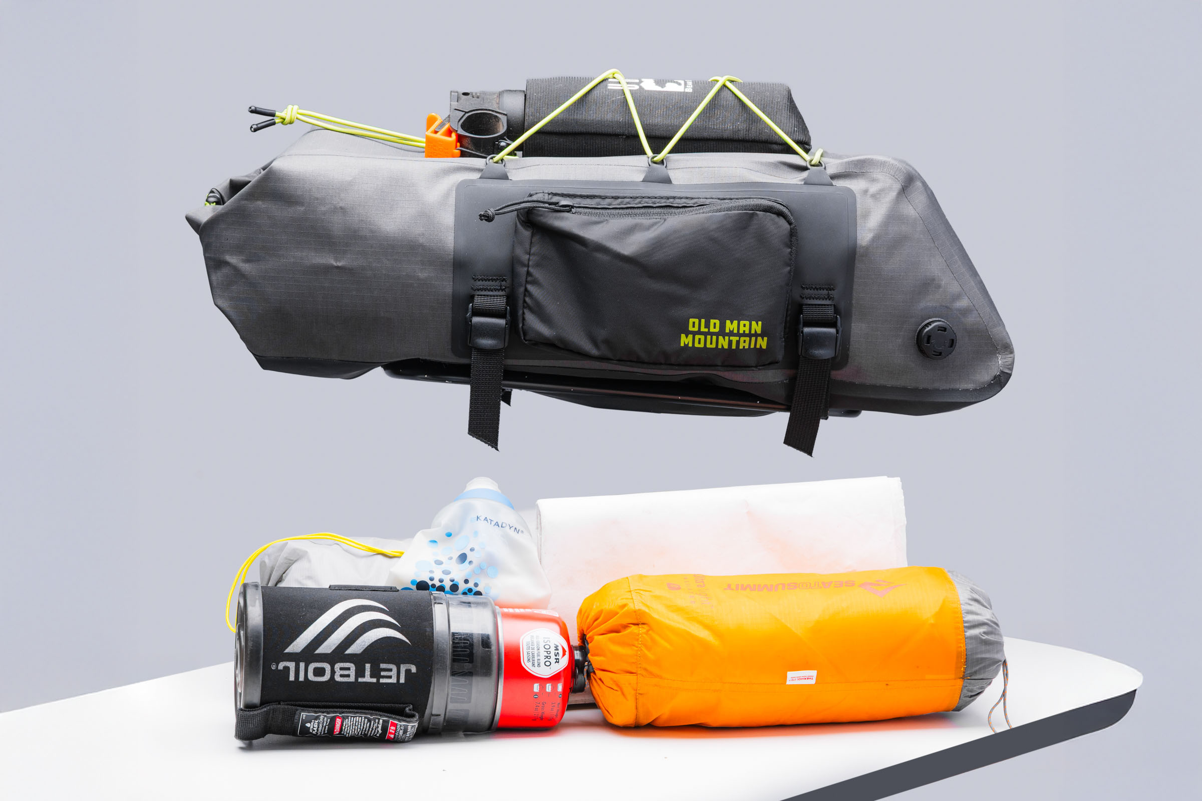 The addition of side pockets is thoughtful and functional for quick-access items. I appreciated the pockets on the Ride Forward Designs rack bags I tested, and liked having two oversized stretchy pockets on the larger version. Old Man Mountain’s pockets are small and capacity-limited, but the secure zippered opening and drain holes are nice touches. I would have loved to see larger, stretchy pockets on both sides. Given the bag’s capacity and heavy-duty waterproof construction, adding an air-purge valve seems logical, especially when stuffing bulky sleeping bags and layers inside. Like most saddle packs, the tapered nose requires some extra attention while packing, and it’s best to stuff in a few smaller items first to make the most of the bag’s capacity.
