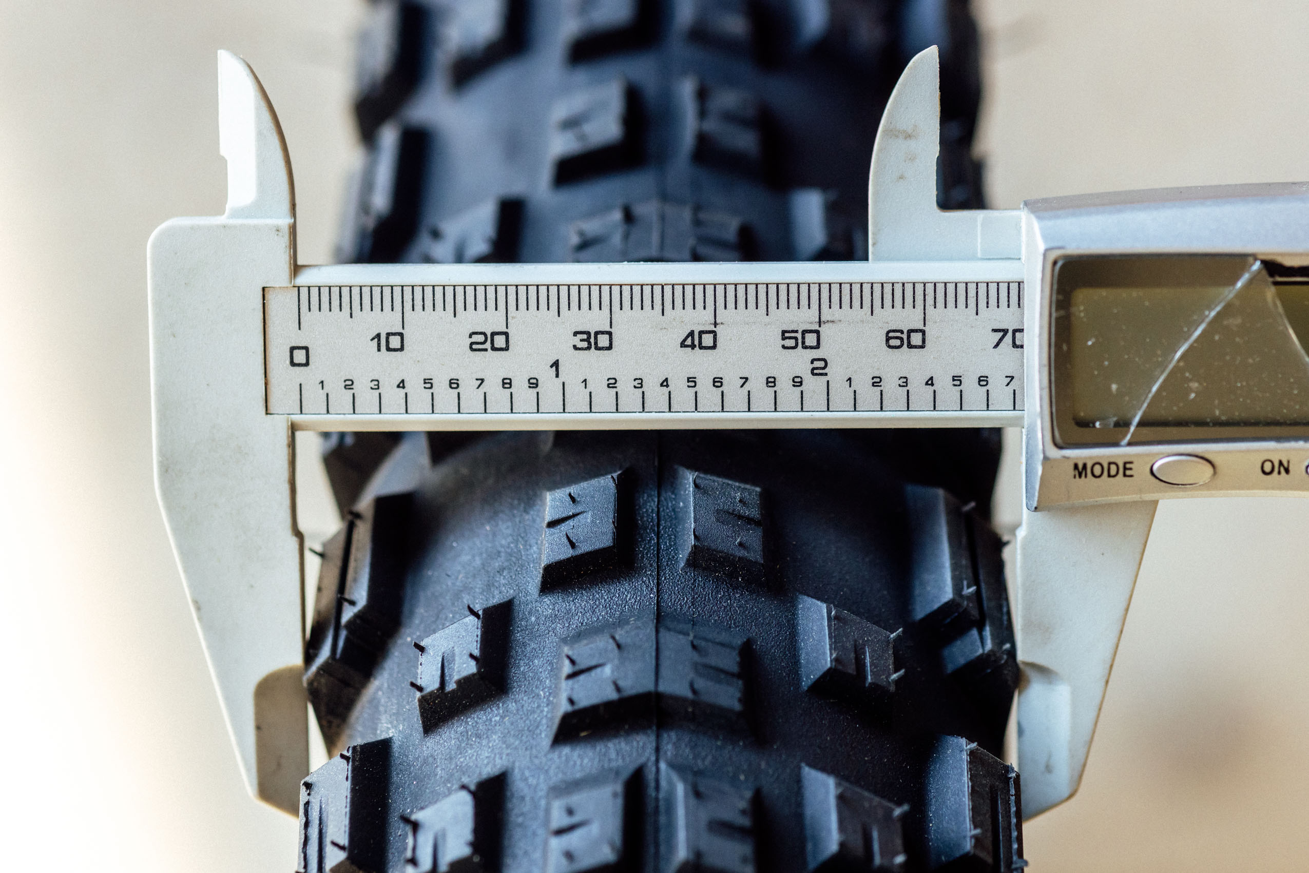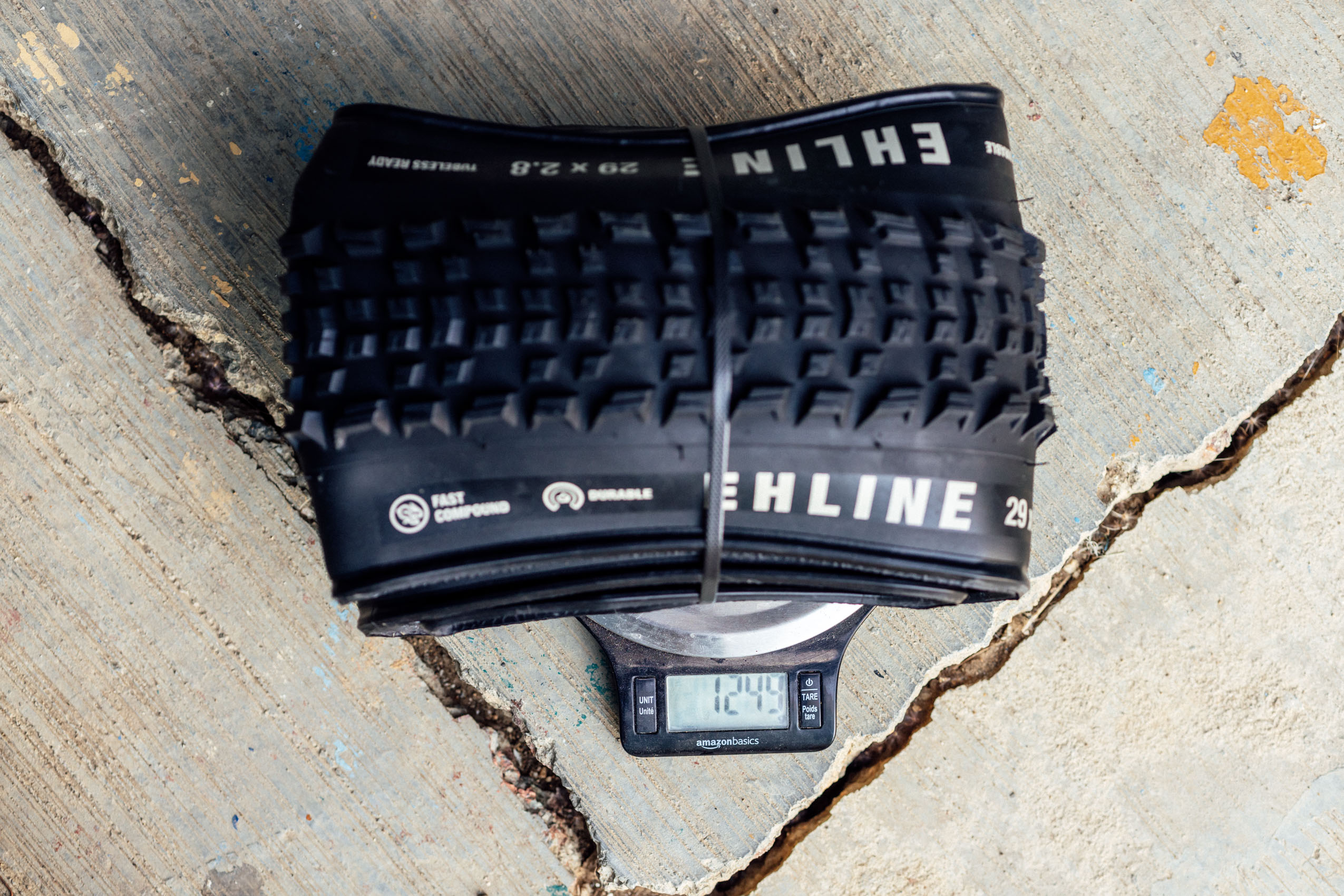The 29 x 2.8” Ehline is basically a scaled-up version of the original. The knobs are proportionally larger than the 2.5, and it measures exactly 2.75” when mounted on my We Are One rims with a 33mm internal width. Like the two other Ehlines, Teravail used a 60 TPI casing with under-tread casing overlap (for improved puncture protection) and a bead-to-bead breaker layer for additional protection against sidewall cuts. The 2.3 and 2.5” Ehlines come in both Light and Supple and Durable casings, but the new 29 x 2.8” only comes in the Durable casing, which makes sense considering its intent for loaded-down and long-distance rides. It’s clearly biased toward durability and reliability, and its weight reflects that. The Ehline registers 1,249 grams on my scale, a bruiser weight when lined up with some other tires. For comparison, here are the weights of a few others from our 29+ Tire Gear Index:
