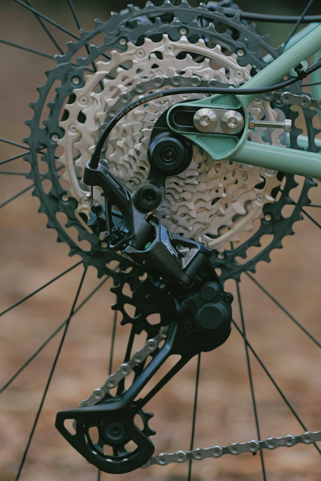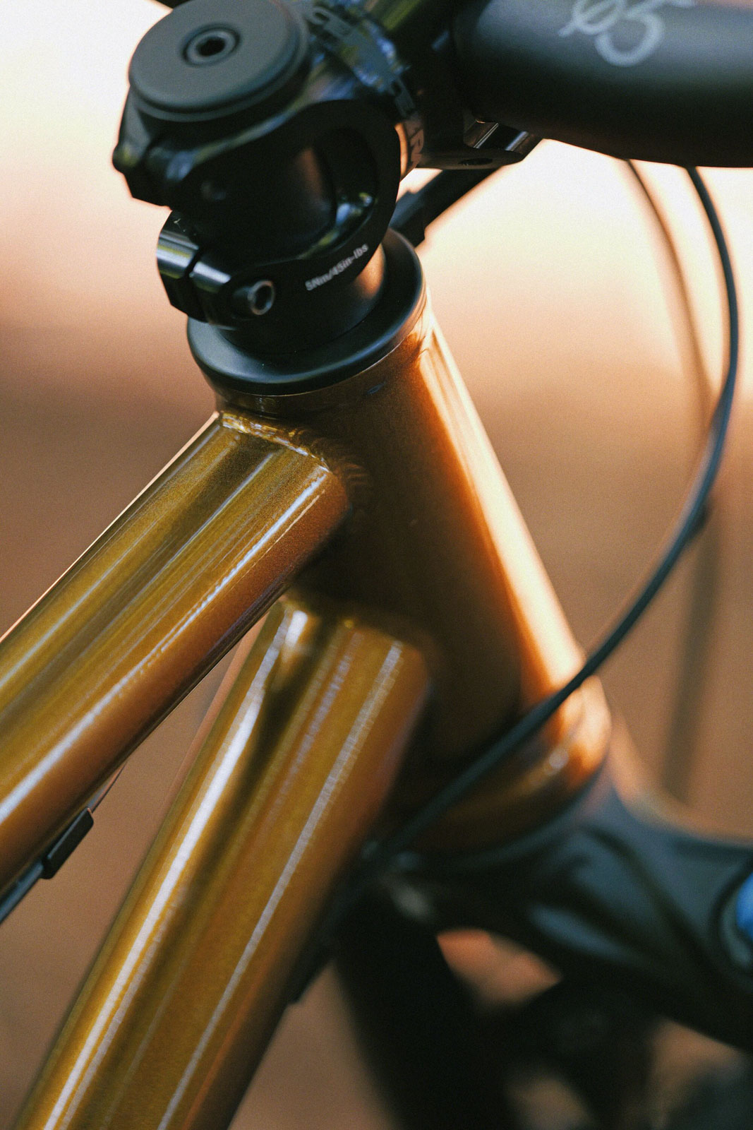 The latest Neuhaus Hummingbird batch doesn’t see any changes to geometry or specs, but they have introduced two new color options: Sage and Metallic Bronze. All the other specs, like 120mm of travel, five sizes, sliding dropouts, and external cable routing, remain the same. The Hummingbird has a 66° head tube angle and relatively short chainstays, which Logan found to be quick, nimble, playful, and great for all-day pedaling.