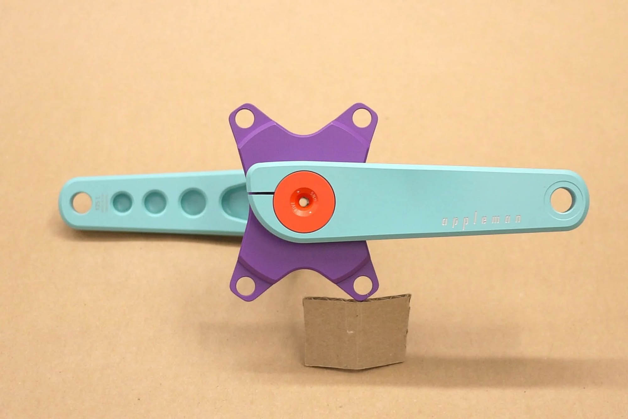 Machined from high-strength aluminum, the versatile Appleman Bicycles 2XR Crankset uses a 30mm spindle that comes in five widths (for road, adventure/gravel, mountain, mid-fat, and fat bikes) and eight lengths (100, 135, 145, 155, 160, 165, 170, and 175mm). They’ll work with 1x and 2x drivetrain configurations. Matt allows buyers to mix and match from a vivid array of 10 colors for their crank arms, spider, chainring, and spindle bolts. All parts are quickly and easily interchangeable without special tools and don’t use any proprietary specs. The extensive range of crank length options enables users to perfectly dial in their fit, something Matt is a big believer in, citing a better position, reduced pedal strikes, more comfort, less toe overlap, and other factors.