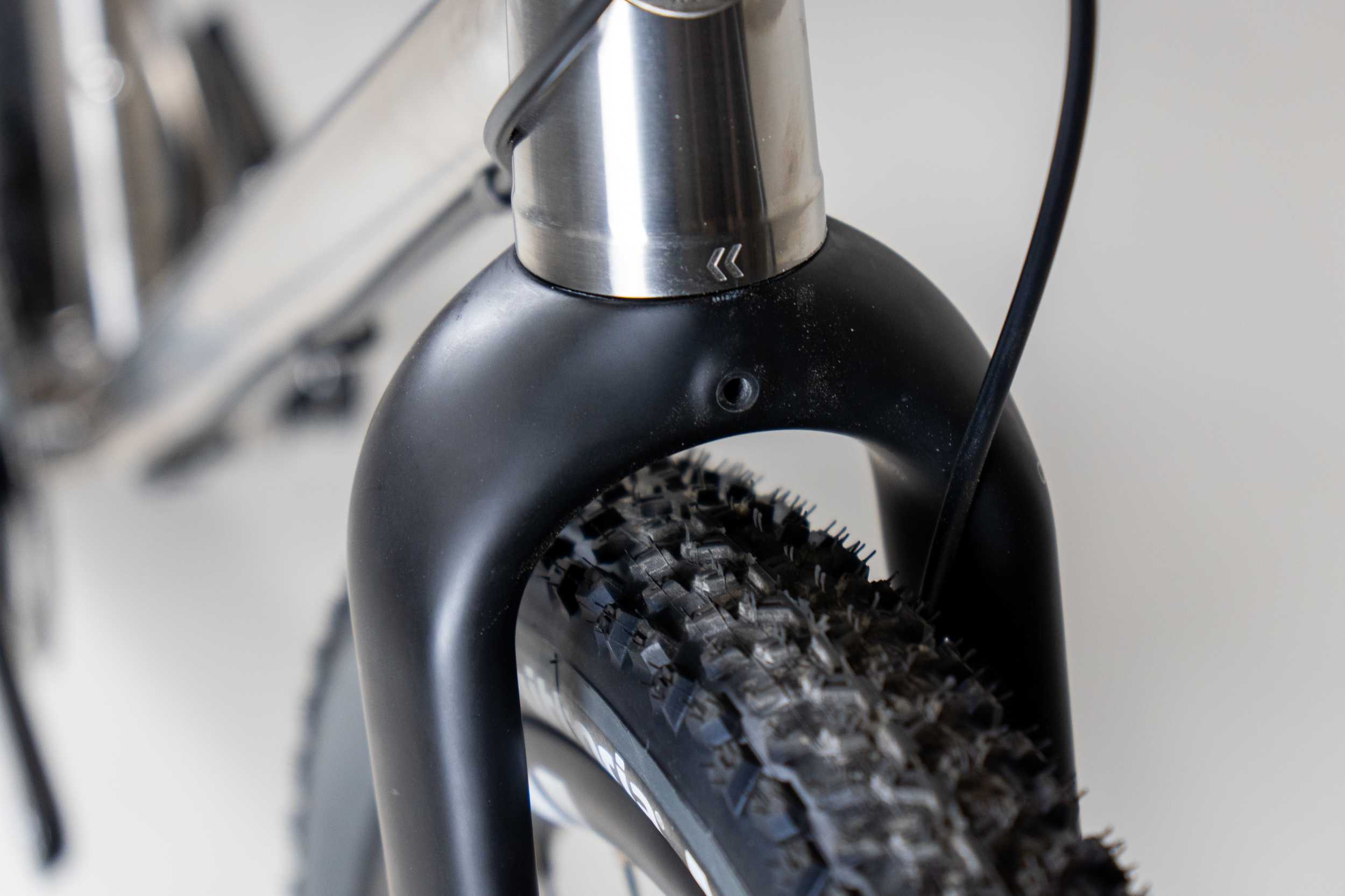 The Big Kev V2 also adds their new Ride 415 VGM fork, a carbon gravel fork that can accommodate massive tires and provide cargo-carrying capability. Three M5 mounts on the legs allow users to carry fork-mounted bags or extra bottles, and the fork is rated to carry up to 8 kilograms on each side.