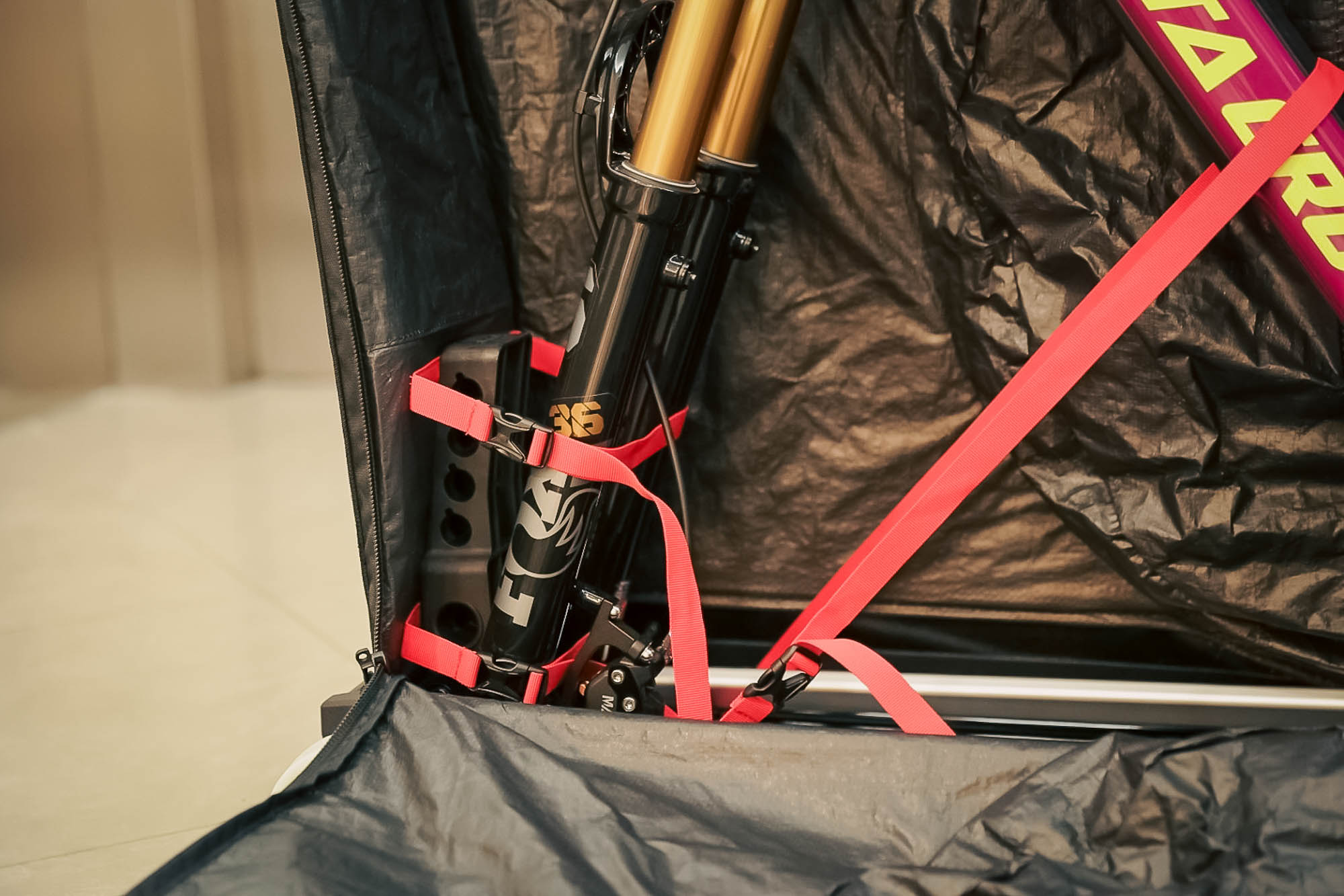 EVOC used a rigid polycarbonate shell for support, which they say is strong and well-suited to the rigors of being tossed around by baggage handlers. Inside, your bike is secured to the included Bike Stand Pro for easier packing and a snug fit, and two padded, integrated wheel bags help to keep your hoops safe. EVOC’s Clip-On Wheel 3.0 design features dual casters that mount under the bag for easy rolling. When not in use, you can flatten the case for storage by removing the stabilizers.
