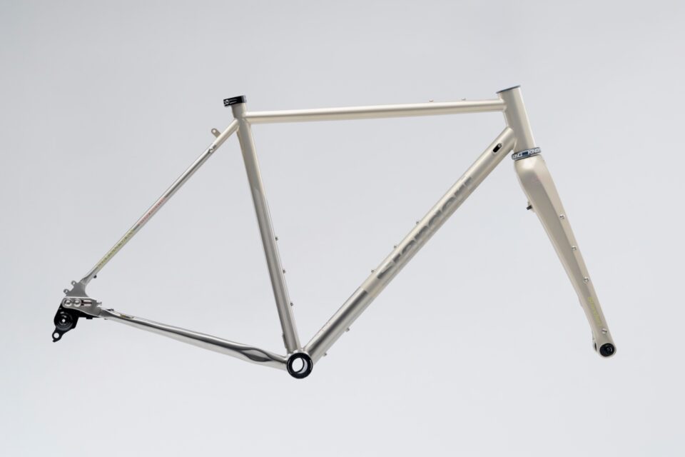 Berlin’s Standert Bicycles just announced two updated colors of their stainless steel Erdgeschoss gravel bike. It clears 700C x 50mm or 650B x 54mm tires, has internal dynamo light routing, and features a rake-adjustable Columbus’ Cross+ carbon fork and sliding dropouts. Other specs include a T47 bottom bracket, UDH, rack and fender mounts, and a Chris King headset. Framesets are priced at €2,399, and complete builds start at €4,499. This year’s model is offered in Golden Brown or White Rabbit color schemes.