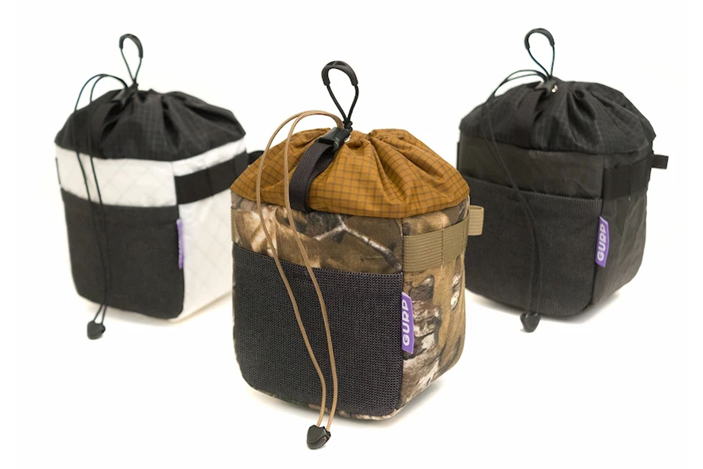 The new Gurp Big Mouth Billie Bag is a larger version of the Canadian maker’s standard stem bag, purpose-built to carry a mirrorless camera with a medium-length lens. It features thicker padding, more structure, and shoulder strap attachment points, with a one-handed cinch closure, front stretch pocket, and a removable lower shock cord attachment for extra stability. The Big Mouth Billie Bag holds 2.25 liters, weighs around 130 grams, and is available in camo (Cordura) or white/black (Ultra).