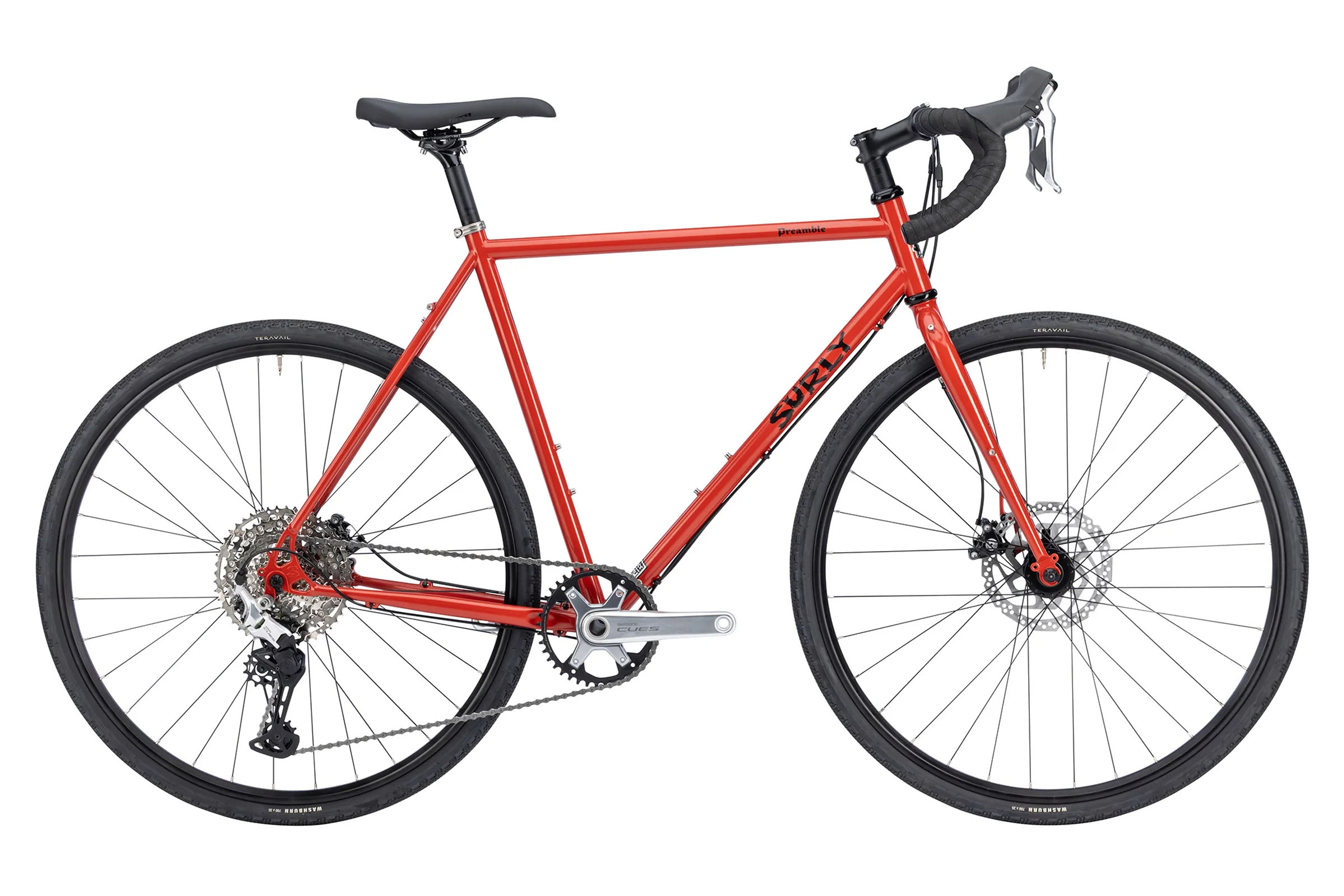 The newest Surly Preamble is built up around a flashy Shimano CUES 1×10-speed drivetrain and a tangy Red Hot Cheddar paint job. The Preamble is a light-duty steel commuter and touring bike based around either 650b (XS/S) or 700c (M-XL) wheels and and fast-rolling 35mm rubber.