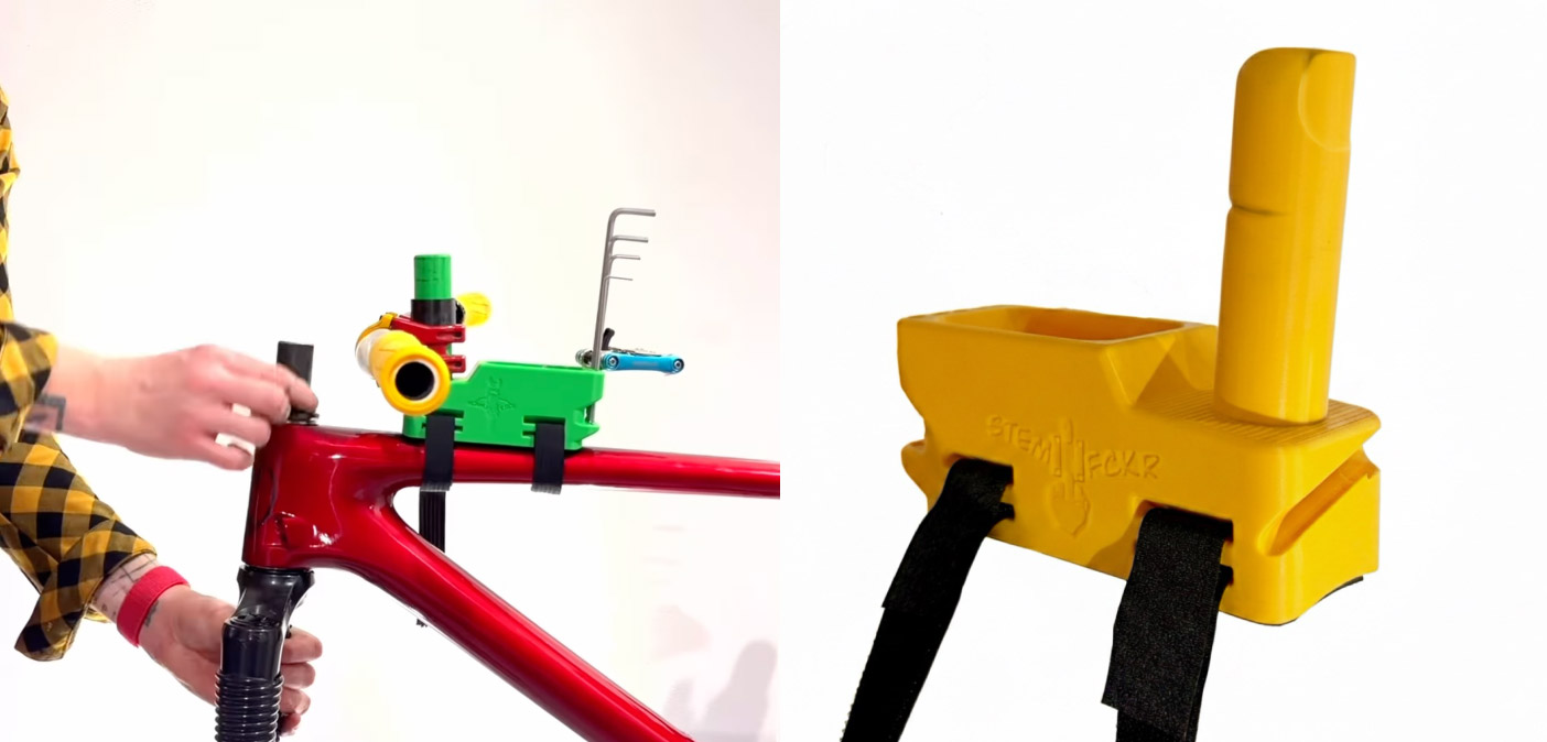The StemFCKR is designed to simplify headset and fork maintenance by eliminating the usual hassle of removing and juggling parts. Instead of balancing bolts and spacers on the workbench, you can place them directly into the built-in tray as you work. Remove the brake, drop the bolts in the tray, unscrew the top cap, loosen the stem and handlebars, and slide the stem onto the finger. Version 2.1 also has a handy groove to secure the brake hose or other cables, keeping everything neatly organized while you service the headset or fork.