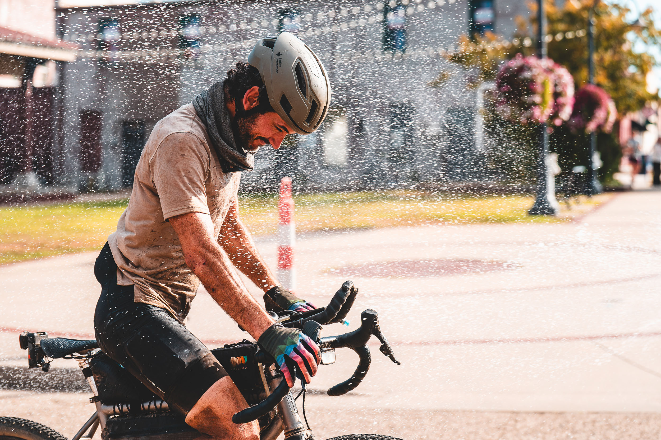 Jacob’s battle with Shermer’s neck began on the morning of the 5th day, as race photographer Kai Caddy spotted him outside of Hot Springs over 700 miles into his ride. This led to Jacob taking apart his entire stem / aero bar combo, flipping his stem in an attempt to raise his posture on the bike. The stem swap offered momentary reprieve before he was forced to get more creative to support what he referred to as his ‘baby bobble head’ neck. This came in the way of his puffy jacket packed in a ball and stuffed in a buff that was wrapped around his neck – it had give, but kept his neck from falling entirely to his chest.