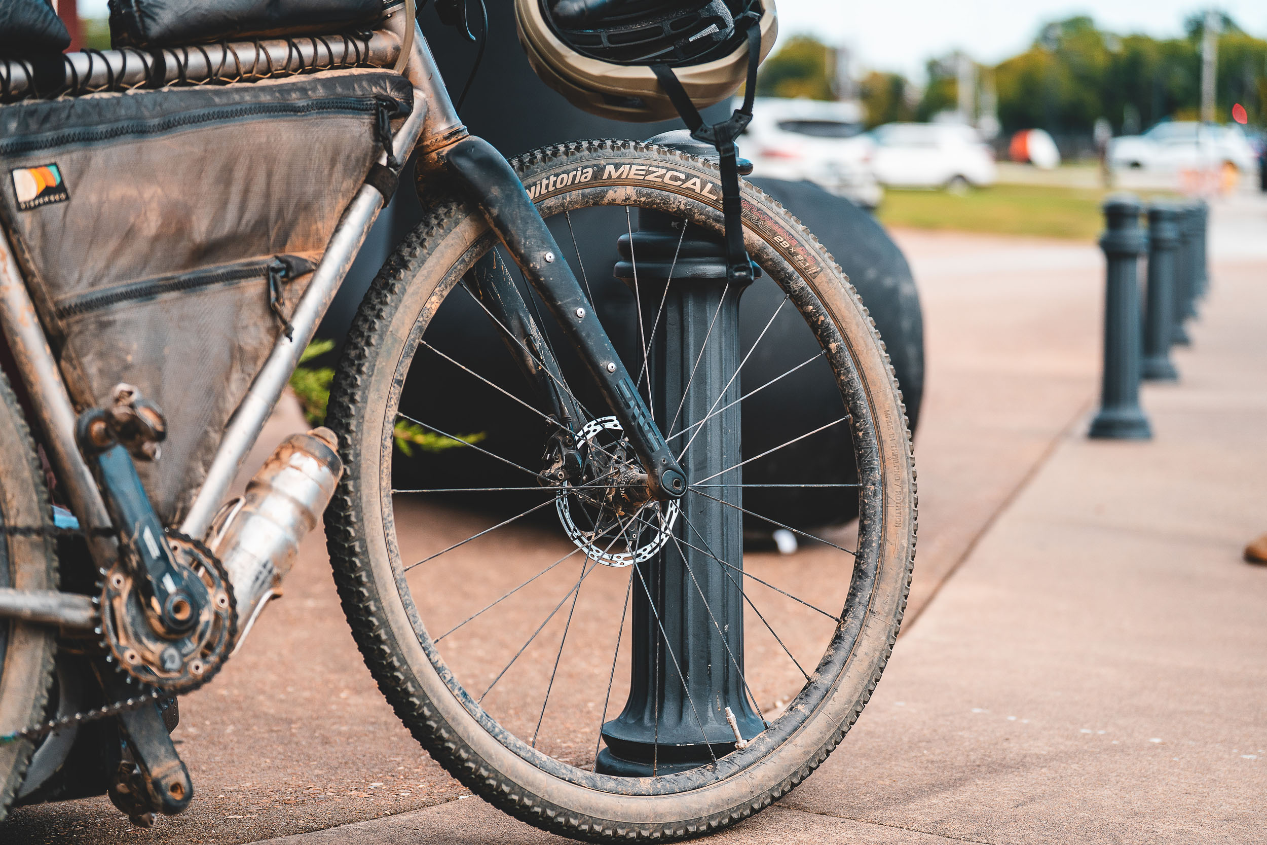 Aboard the straight gauged titanium Mosaic GT-2 X, Jacob ran an Enve fork and cockpit, rolling on 29 x 2.1″ Vittoria Mezcals. Up front he ran a Coros Dura for navigation, topping it off just twice along the route. In the back, he had his Spot Gen 4 tracker hard mounted to the saddle, alongside his gremlin bell. The bike was outfitted with Dispersed Bikepacking luggage, carrying his rain jacket, puffy jacket, and emergency bivy in the upper half of his frame bag. He ran a water bladder in the lower half of the frame bag, with an extra bottle mounted to the down tube.
