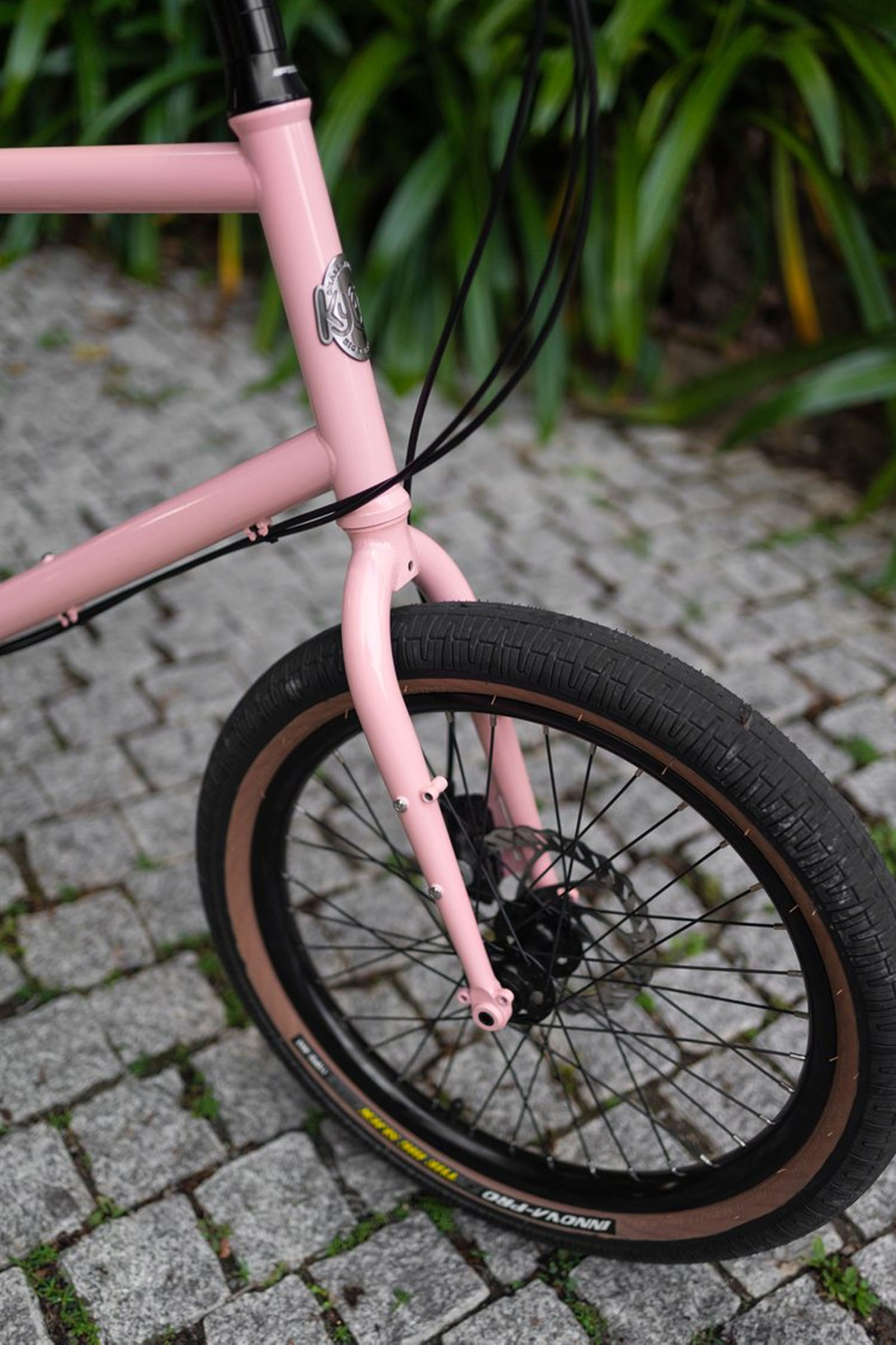 The Kyoot Rolly Polly is a new mini-velo featuring a Taiwan-made 4130 triple-butted Chromolyframe and fork, 68mm threaded bottom bracket, SRAM UDH rear dropout, and a construction that’s burly enough to pass ISO mountain bike standards. Unlike the Itty Bitty, the Rolly Polly uses thru-axles, a two-piece 165mm crank, and external cable routing to make maintenance a breeze. It has mounts for bottles, racks, and fenders, and it can clear up to a 20 x 2.5″ tire.