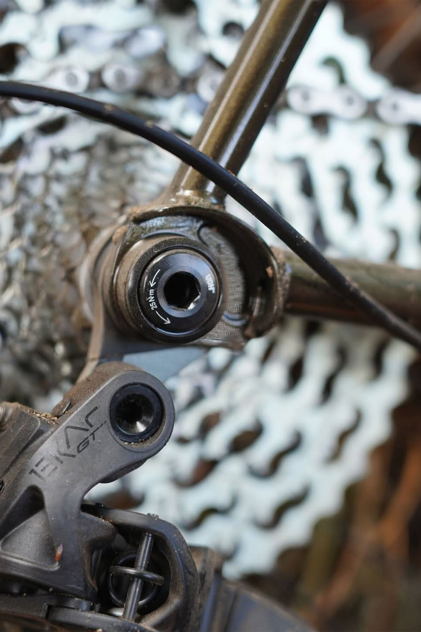 The Neuhaus Big Leaf is described as “a mountain biker’s steel gravel bike.” It’s built up around a quad-butted, heat-treated 4130 steel frame, a color-matched carbon fork, and a wealth of great specs, including 12mm thru axles, a threaded BSA bottom bracket, tapered head tube, and a UDH rear dropout. Like their hardtail, the Hummingbird, the Big Leaf is designed around size-specific tube sizes for a consistent ride feel across the size range, every size has two standard bottle mounts, and external cable routing is used to simplify maintenance. The fork has three-pack mounts for cargo cages, there are top tube mounts for bolt-on bags, and there is room for 700 x 55 (29 x 2.1″) tires.