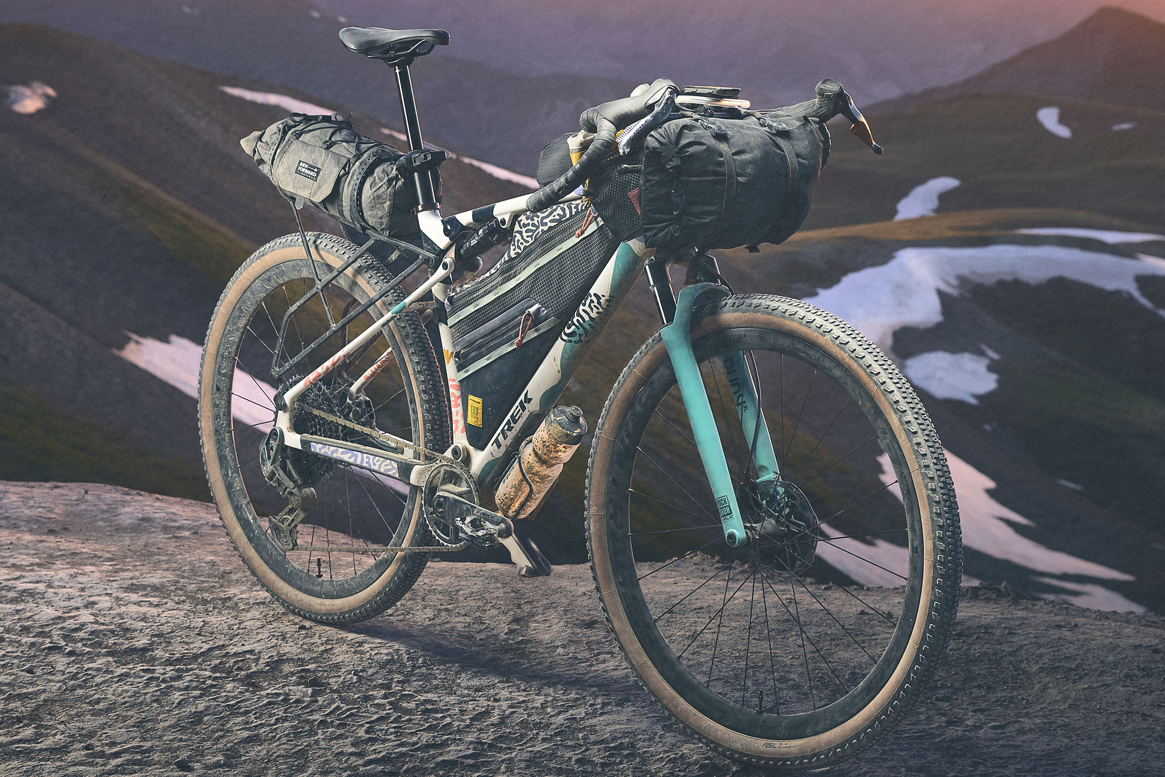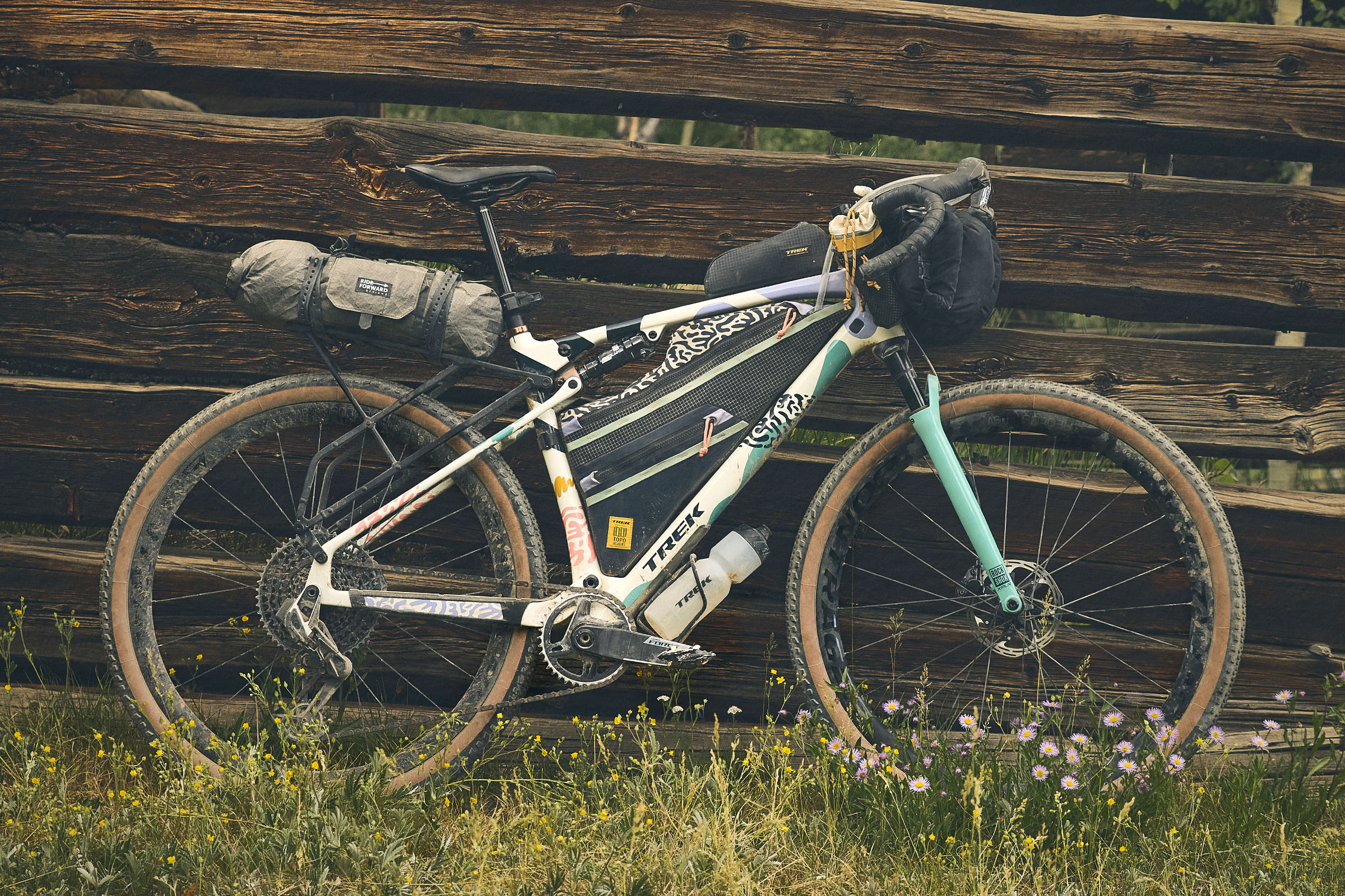 To fill that massive main triangle, Trek partnered with Topo Designs on a custom frame bag to fit both the frame and the bike’s colorway. There aren’t many details available yet, but the bag has two main zippers, a full bolt-on attachment, and funky mix of fabrics and colors.