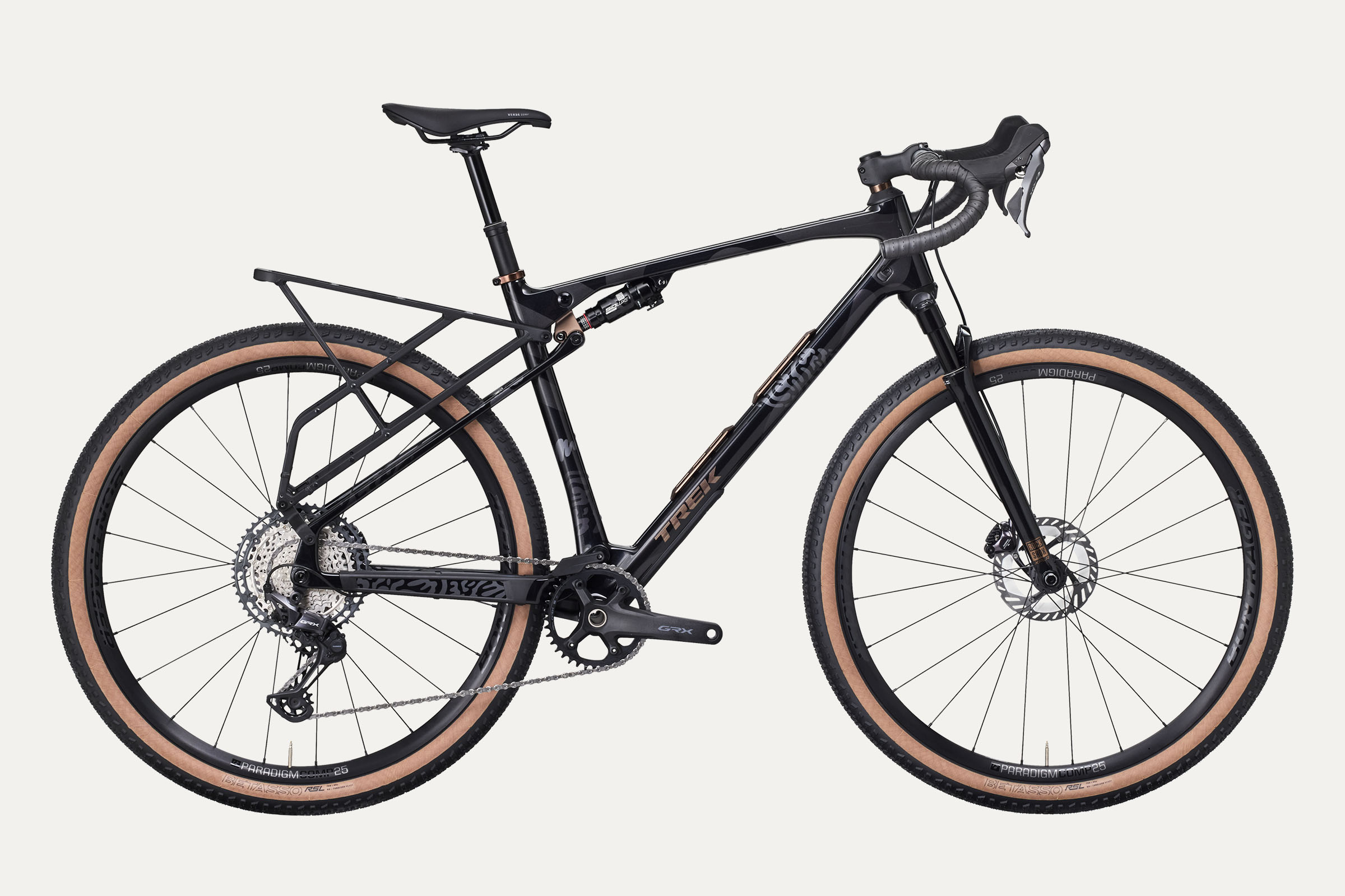 At its core, the new Trek CheckOUT is a carbon full-suspension adventure-gravel bike. According to Trek, it’s designed to be “faster than a mountain bike on paved roads and more capable than a rigid gravel bike on singletrack. It’s the ideal rig for road-to-gravel-to-singletrack adventures, ultra-endurance events, extended bikepacking trips, and more.”