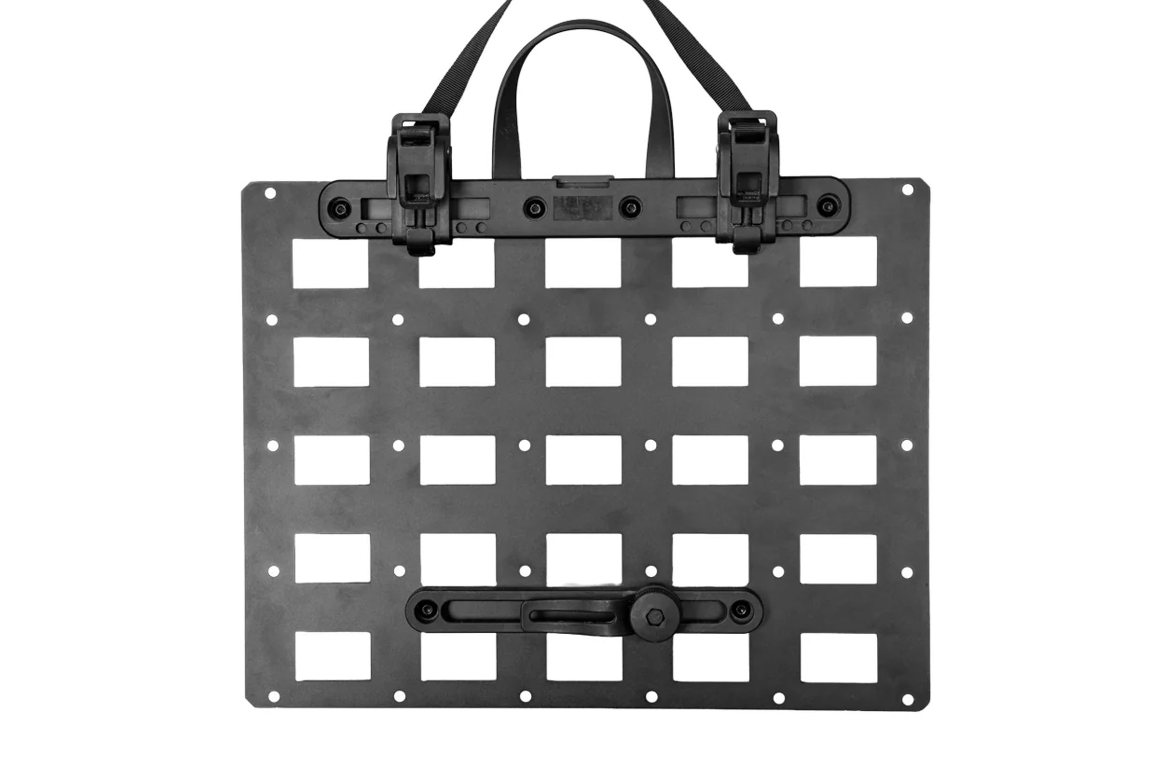 The MOLLE Pannier Rack is made from laser-cut aircraft-grade aluminum. It has a MOLLE lattice grid for securing MOLLE-compatible pouches and bags, as well as 26 threaded bosses spaced for standard bottle cages, allowing you to get creative with cargo cages and other things that mount with bolts. The rack uses standard pannier hardware, with quick-release plastic hooks up top and an adjustable plastic lower hook. A single panel weighs 2.1 pounds (925 grams), which seems fairly heavy when factoring in the weight of the rack it attaches to. The MOLLE panel’s clips fit 10mm rails with the included inserts, and 15mm rails with the inserts removed. Priority states the load limit is 20 pounds (9 kilograms).