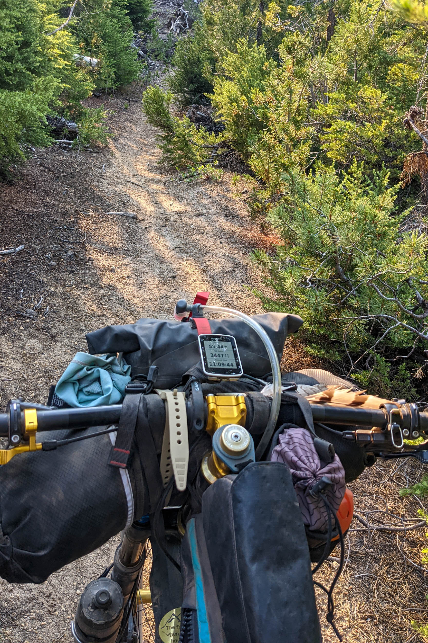 My forever-bike shown here is a Sycip Designs custom steel frame. I’ve had this bike for about as long as I’ve been bikepacking. When I first got hooked on bikepacking (my first adventure being on our gravel bikes in Death Valley), I started looking for a hardtail for more singletrack-focused routes. There was really nothing out there that checked all my boxes. I’m really tall but not proportioned like most off-the-shelf bikes are built for—long reach and shorter legs—which is the exact opposite of what I fit. The low standover common in the industry at the time for capable hardtails seemed like a waste of optimal framebag space, too.