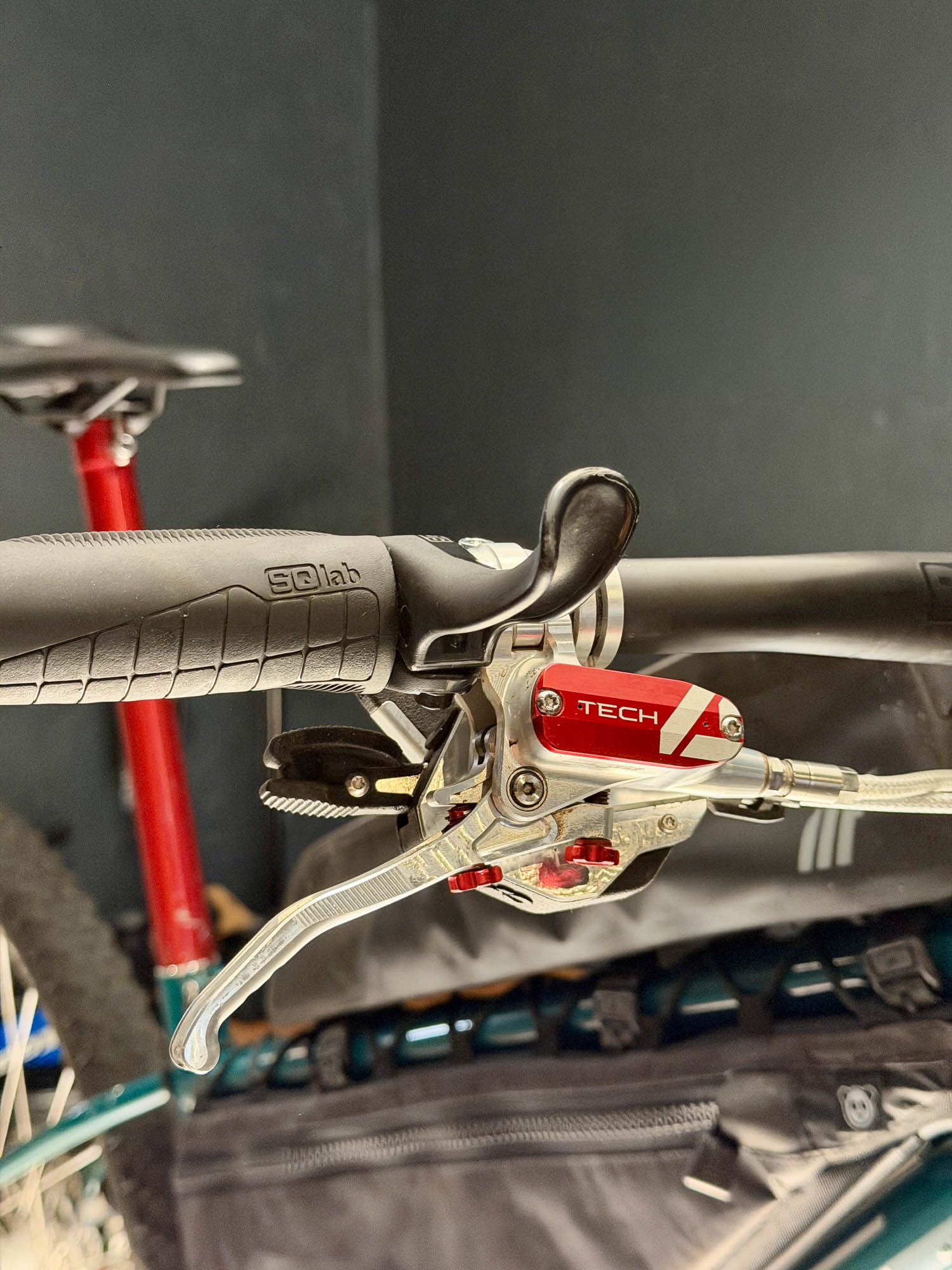 Finally, the energy must return to the rider. All contact points—saddle, grips, bars—come from SQlab, each stamped with the caduceus. Here, the bike’s transformed energy flows back into the human body. Red accents mark the completion: a red seatpost and hints of crimson on the brakes. The fire of Rubedo courses through the system, compressing and releasing, delivering transformation not only to the bike but to the rider himself.