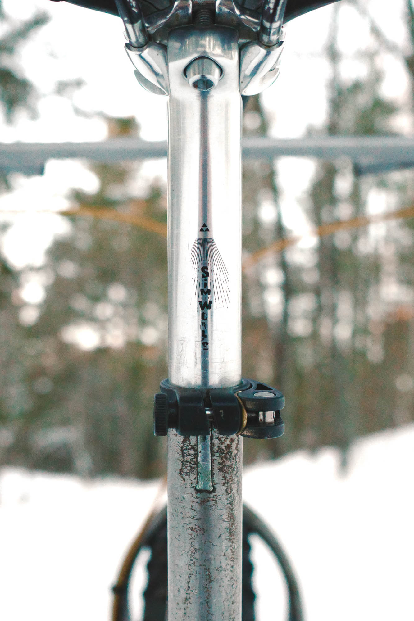Chris and I hit it off, talking about all kinds of unique bike concepts and sharing photos of previous bike builds. My first fat bike was a Surly Moonlander. I was captivated by the design’s resourcefulness. It used an offset frame and fork to run 135mm hubs front and rear, allowing you to swap the front and rear wheels for ultimate utility and versatility. To this day, I still believe that the first-generation Surly Moonlander is one of the greatest bikes ever made. I owned a Moonlander for many years, but I never could get it to fit me quite right. I was pleased to learn that Chris had been building single-speed/fixed-gear bikes with 135mm spacing up front and back so he could swap wheels around, offering more gear ratios on board, whether fixed or free. This greatly piqued my interest, as this format was something I sought after.