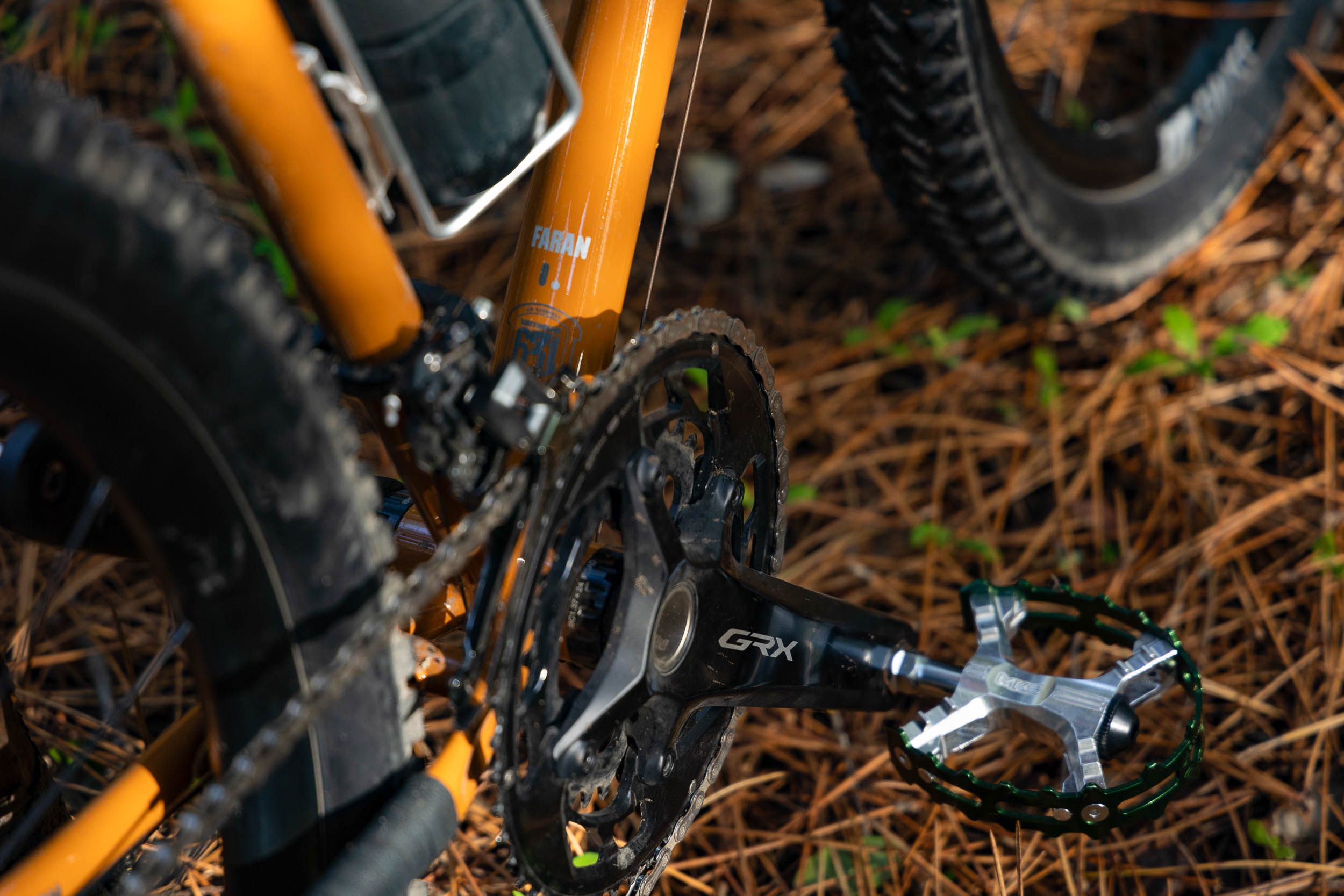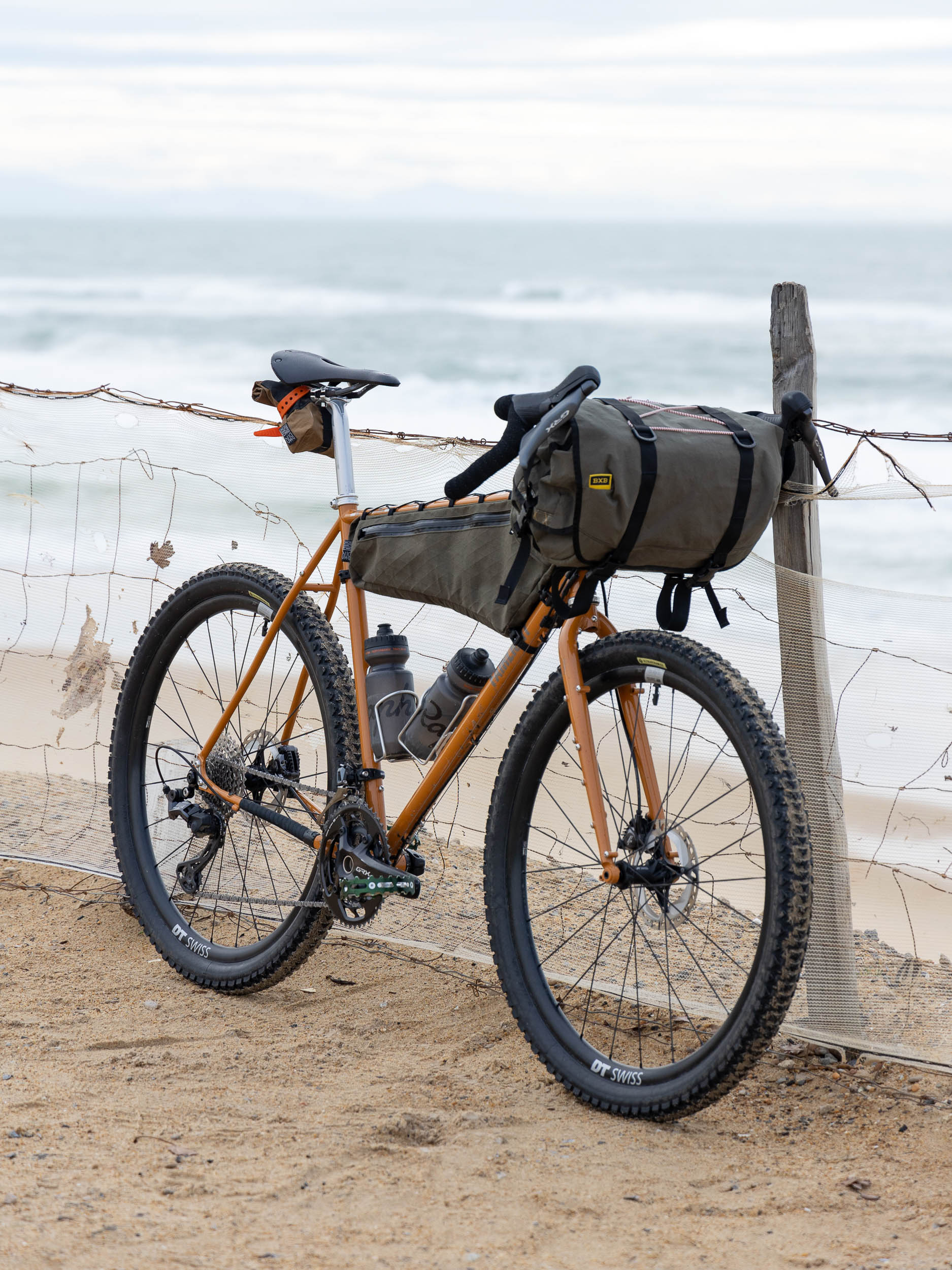 As a little bonus, the frame color blends in perfectly with the woods in my backyard. Also, check out the gorgeous exclusive BIKEPACKING.com details, including the bar end plugs and dropout plates made by Bentley Components! On the tall sizes, the big head tube allows for a nice big custom frame bag (made from Marion & Quentin in Dijon, France), with plenty of room for gear.