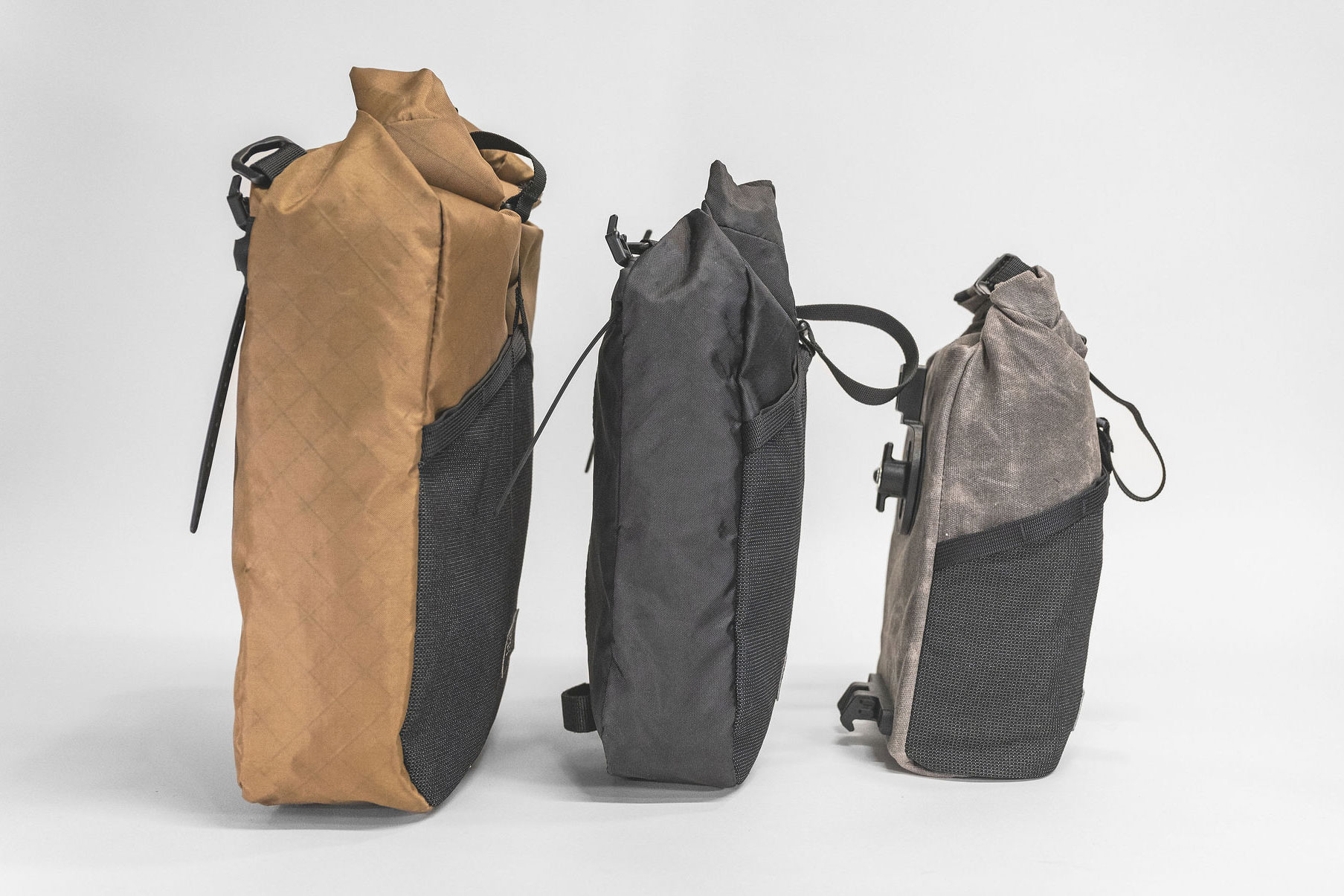 Taking some design cues from the Micro Panniers, the other two models have received a helpful update that doesn’t detract from their simplicity but appears to make them even more functional. The biggest change is moving from the two side buckles on the roll-top closure to a single center side-release buckle, paired with an adjustable compression strap beneath. Overall stability and structure have also been improved with a new laser-cut CSM (Chlorosulfonated Polyethylene) back panel and an HDPE stiffener rod at the upper attachment point.