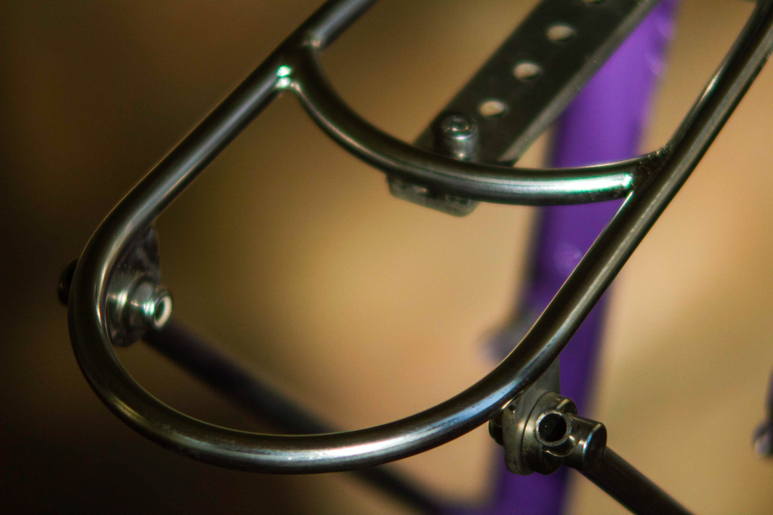 The Starfish Bicycles Silver Heron is made of polished stainless steel and has classic French rando styling. It uses a three-point attachment system and has an intentionally conservative weight limit of just 3 kilograms (6.6 pounds). The Silver Heron measures 209mm front to back, 112 side to side, and 120mm from the bottom of the platform to the top of the tombstone. It weighs 450 to 500 grams including hardware and depending on leg length; buyers can choose between 300 or 450mm legs to suit their fork. A daruma system for adjusting the legs makes it compatible with just about any bike with a drilled fork crown for the upper mount.