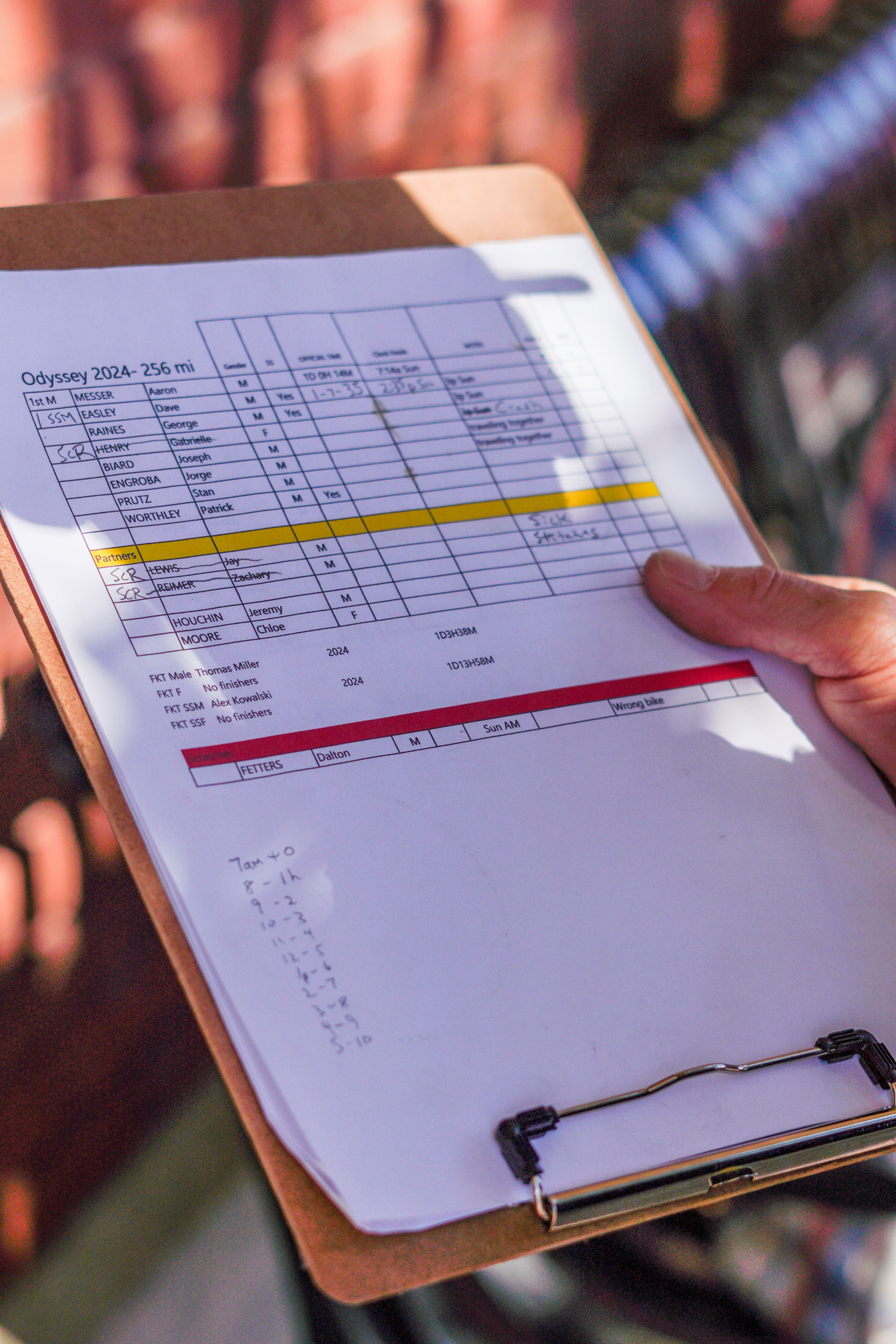 Looking into the numbers a bit further down Chuck’s clipboard, this year’s full route saw a 66.6% scratch rate—the highest ever. As the scratch list reads, day one saw a broken rear hub from Justinas Leveika as well as a crash from Logan Meyer. Day two brought on four more ranging from the “wrong bike” to “lung sickness.” As the race grew longer, the scratches became much more physical with one achilles injury and three undercarriage issues described as a “shattered taint”, a “Shredded Taint”, and a “taint in tatters.” For those unfamiliar with that parlance, taint a slang term for one’s undercarriage or the perineum, the area that sees lots of friction with the saddle over the course of these longer races. Circling back to the weather induced scratch theories, we could argue that the high Arkansas humidity levels contributed to these specific issues. Despite no rain, it can be plum wet riding through low lying valleys in the night, which adds to the complexity of self-care needed to sustain oneself for over a thousand miles.