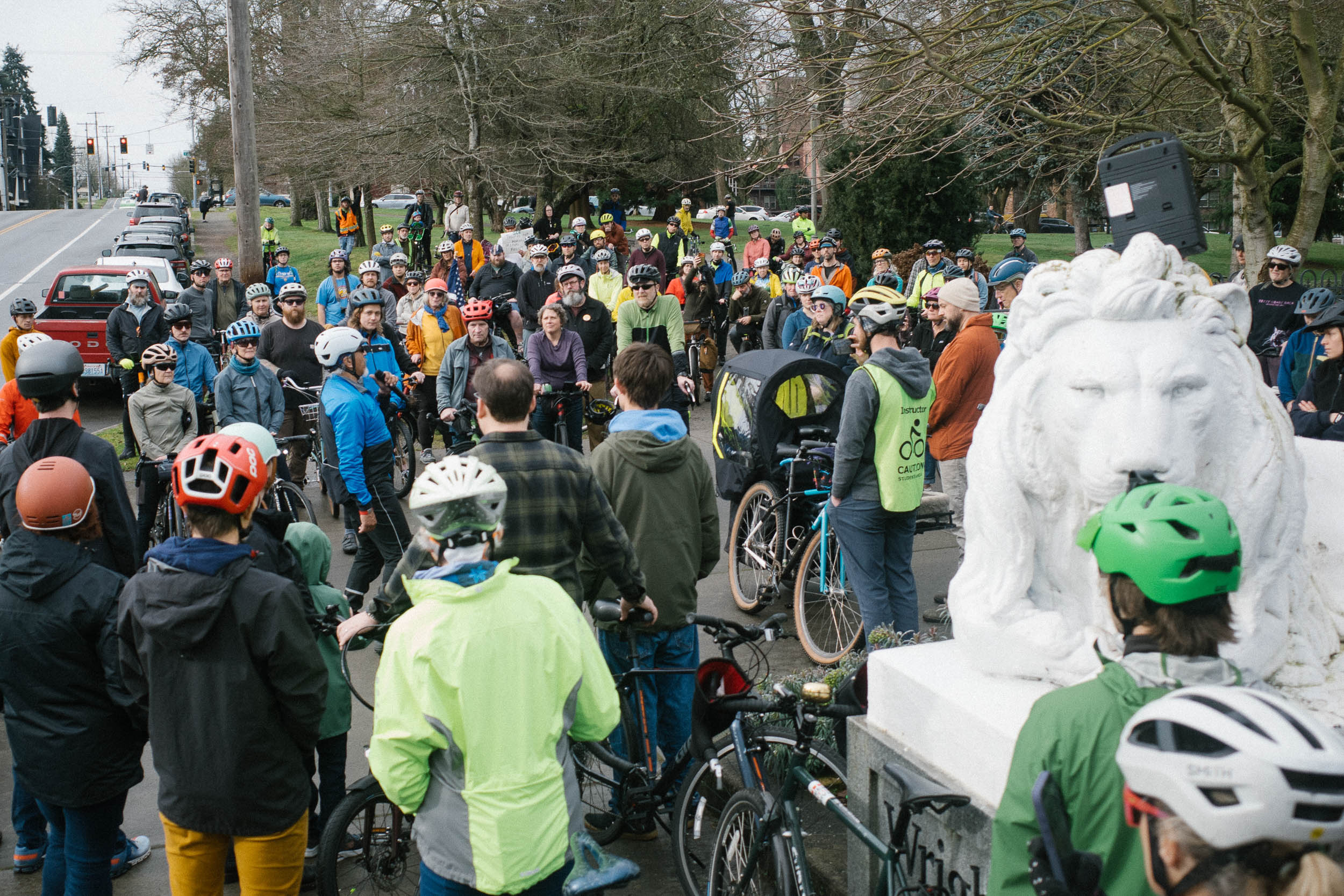 The following morning, I continued the momentum by returning to Tacoma to participate in another city-wide ride hosted by Goldspoke, Opalescent Cyclery, 2nd Cycle, and Tacoma Kind Rides. I arrived at the community cycling center, where a large crowd had already amassed, seeing many friends I’d met at previous community rides. We then embarked on a casual ride around Tacoma, eventually making our way to Wright Park in the center of town. Various speakers came forward to express their gratitude and their inspiration for taking to the streets that day. I stood and listened to their testimonies, inspired by the convergence of so many communities in solidarity around a common goal: to keep cities safe and welcoming to the immigrants who make our country so great.