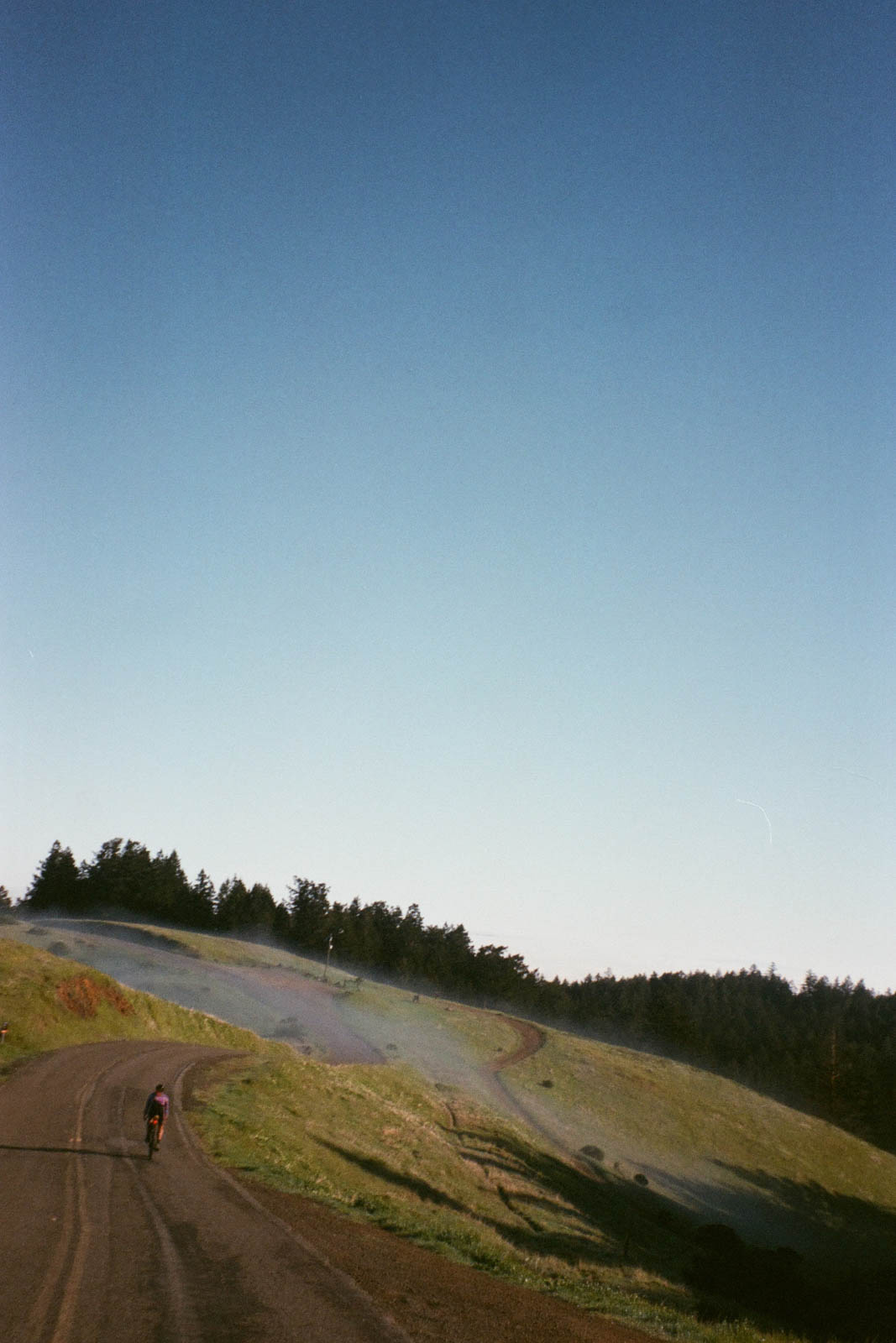 A clear pack of tryhards has separated itself from those who feel assured of their intrinsic value. We are not racing per se, but no one is letting themselves get dropped, either. We introduce ourselves while climbing Skyline Trail. Bryan is high on fitness from Atlas Mountain Race. Fergus is riding a pink bike with the quiet sophistication of a connoisseur. Sean’s flowing blond hair and flame-printed kit make the rest of us look like country mice. Zach, the USA ultra champ with his aero bars and helmet, is affable but quiet, his mind clearly on the task ahead. He seems to know something we do not.