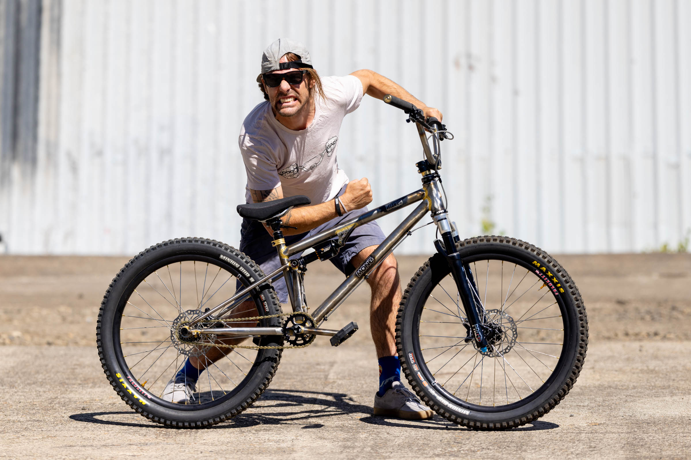 Alongside the squishy BMX, Cjell brought his Small Batch Straight Bar, or SB2 for short, which debuted in 2023. The SB2 features the twin top tubes reminiscent of the klunkers of yesteryear and coaster-specific-ish brake allowances. It can be paired with Mone’s bi-plane fork for folks who want to run disc front and rear. “I encourage everyone to grab a coaster bike and ride a boring trail near them. Hilarity is pretty much guaranteed,” Cjell beamed.