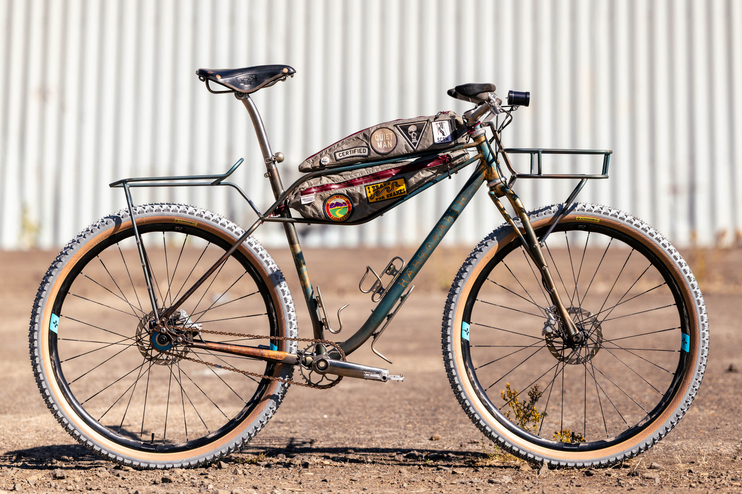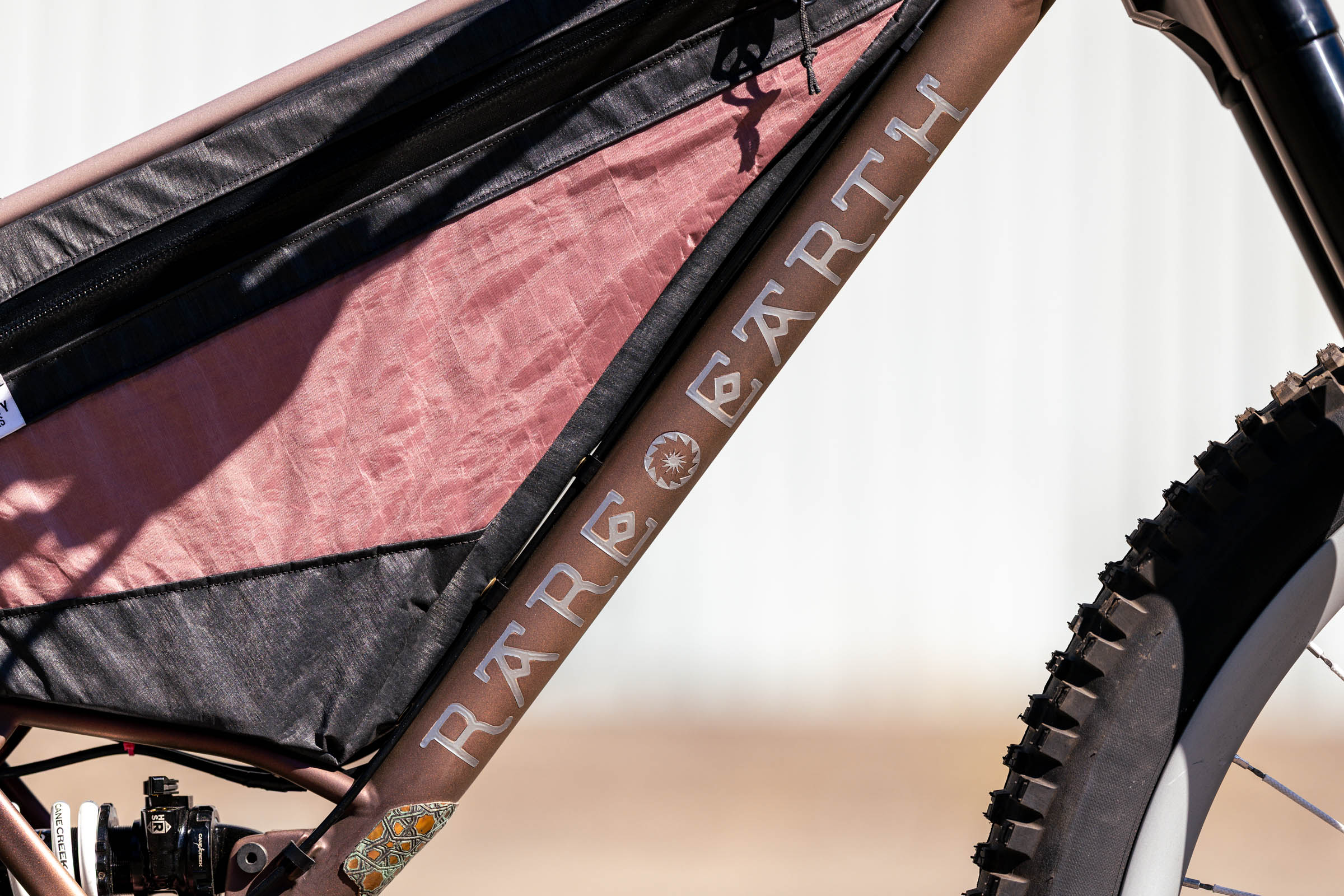 We shared the Rare Earth Righteous Gemstone on the website this spring, and I had high hopes that Brian would bring it to MADE so I could see it in person. Designed to tackle the Tour Divide, the Righteous Gemstone is a collaboration with Rare Earth customer Randy Windle from Arkansas. He was after a one-of-a-kind bike to match his unique aesthetic. The final product walks the line between functionality and art. The finish is inspired by jewelry-making patinas, and after a lot of experimentation, Brian figured out a layering sequence with multiple powders and some textured copper leaf to achieve the final look. The cherry on top is a piece of Hachita, New Mexico turquoise integrated into the head badge.