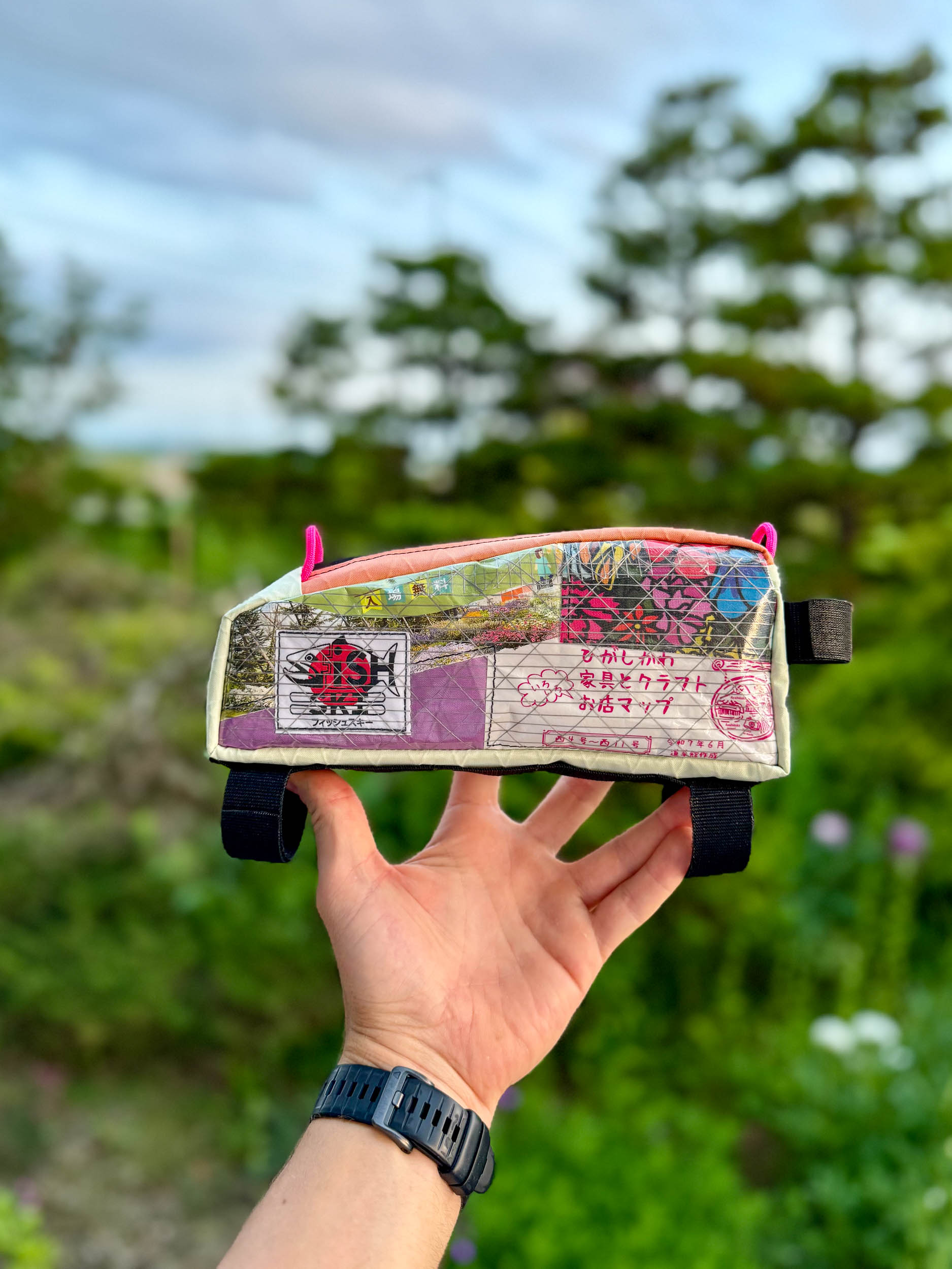 We met many other bikepackers along the way, often greeted first with confusion, then laughter, as we mimed our explanations through the language barrier. We weren’t in a rush, and if the people we met weren’t either, I’d offer to stop and sew them a bag for their bike. Sometimes it was an OniGeari or a Bevvy Carrier, both originals that quickly became must-haves for any biking adventure, especially in Japan.