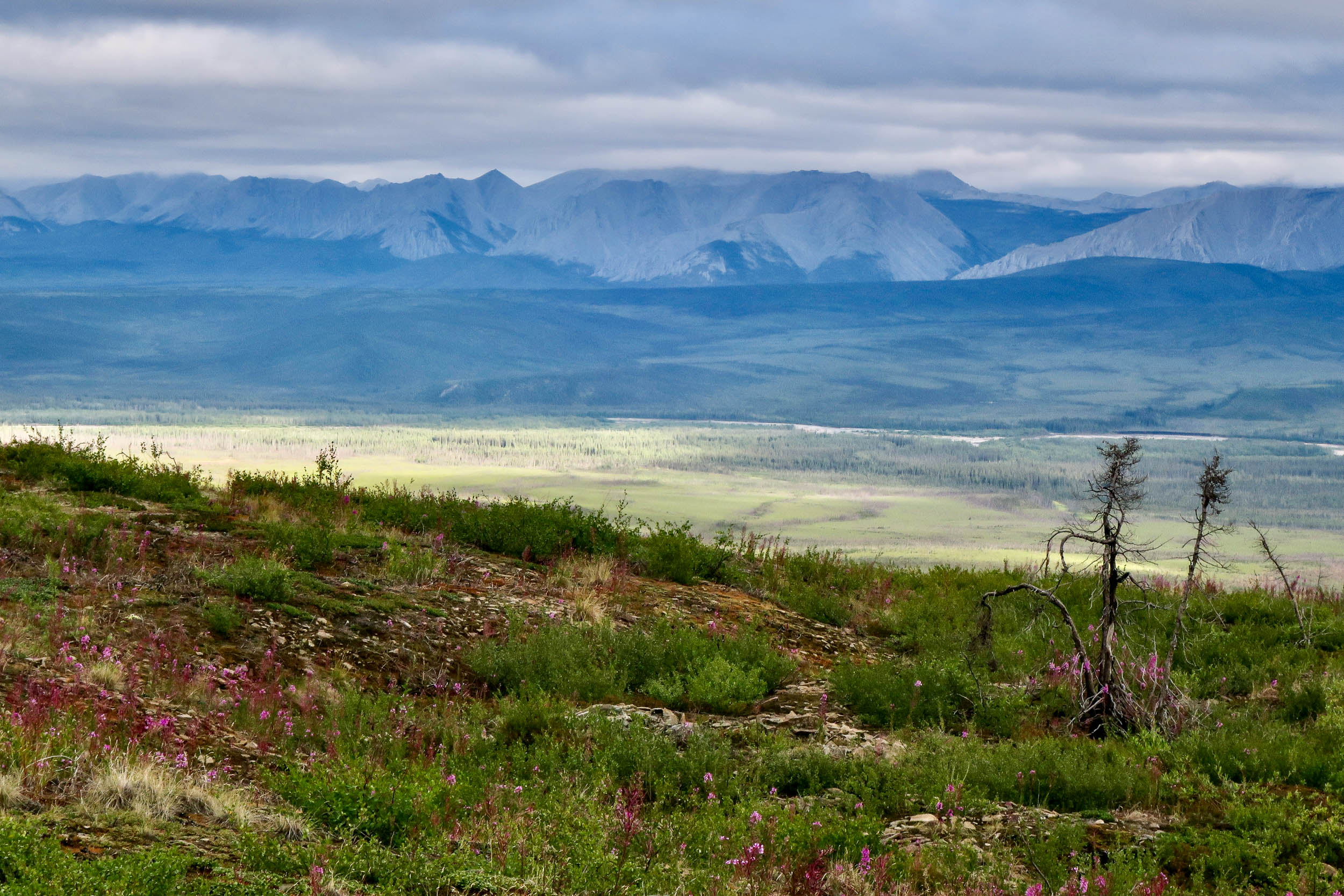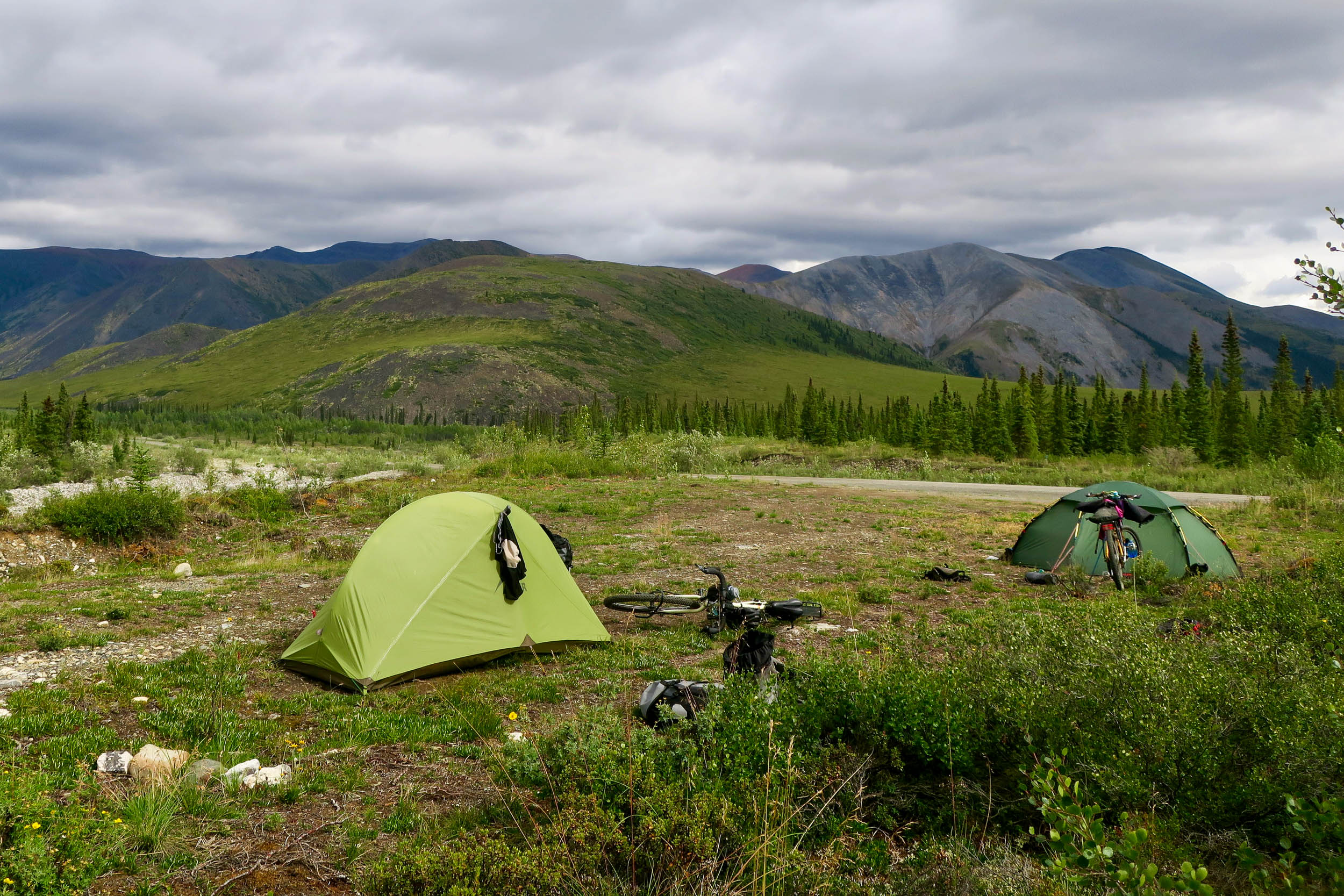 We climbed steadily for the first two days, entering the sub-arctic splendour that was Tombstone Territorial Park. The transition in the landscape from meadow to peak was so fluid, it was as if the earth was heaving. Slivers of sunlight in between clouds turned sections of the permafrost valley lime green, highlighting a small pond below. The interplay of browns and greens on the hills created a smooth, rippling effect, like a series of waves frozen in time. We experienced it all in a thrilling descent to one of the most scenic wild camp sites of the trip—a gravel pullout surrounded by mountains, perched above a small stream.