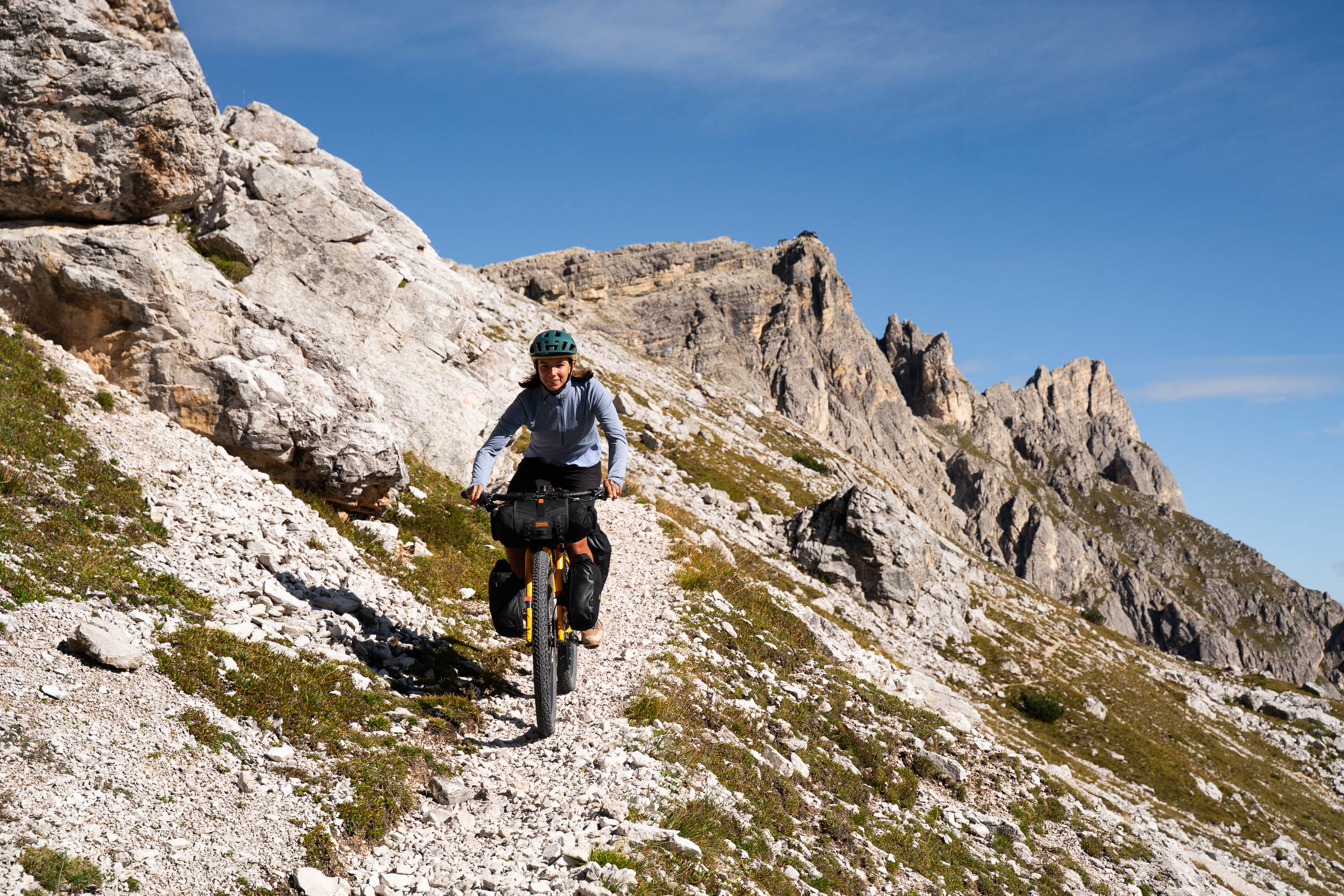 It wasn’t all about the views, though. We love our food and probably discuss our next snack or meal about 80 percent of the day. Our cravings were more than fulfilled in Italy. As we set out to ride the Trans-Dolomiti bikepacking route, we made sure to eat copious amounts of pasta to ensure we could make it up and over the some 9,500 metres of climbing along the 262 kilometres of the finest scenery in the centre of the national park. Each day took us through town or a village, which allowed us to tuck into fresh-baked goods, and it also meant we didn’t have to carry more than a day’s worth of food, which helped with the steep hike-a-bike sections.