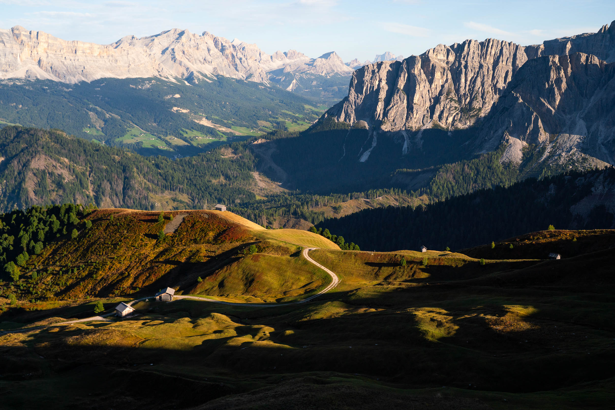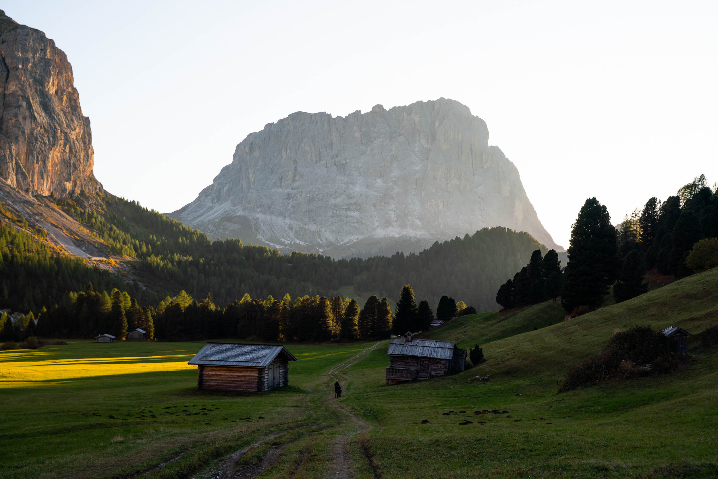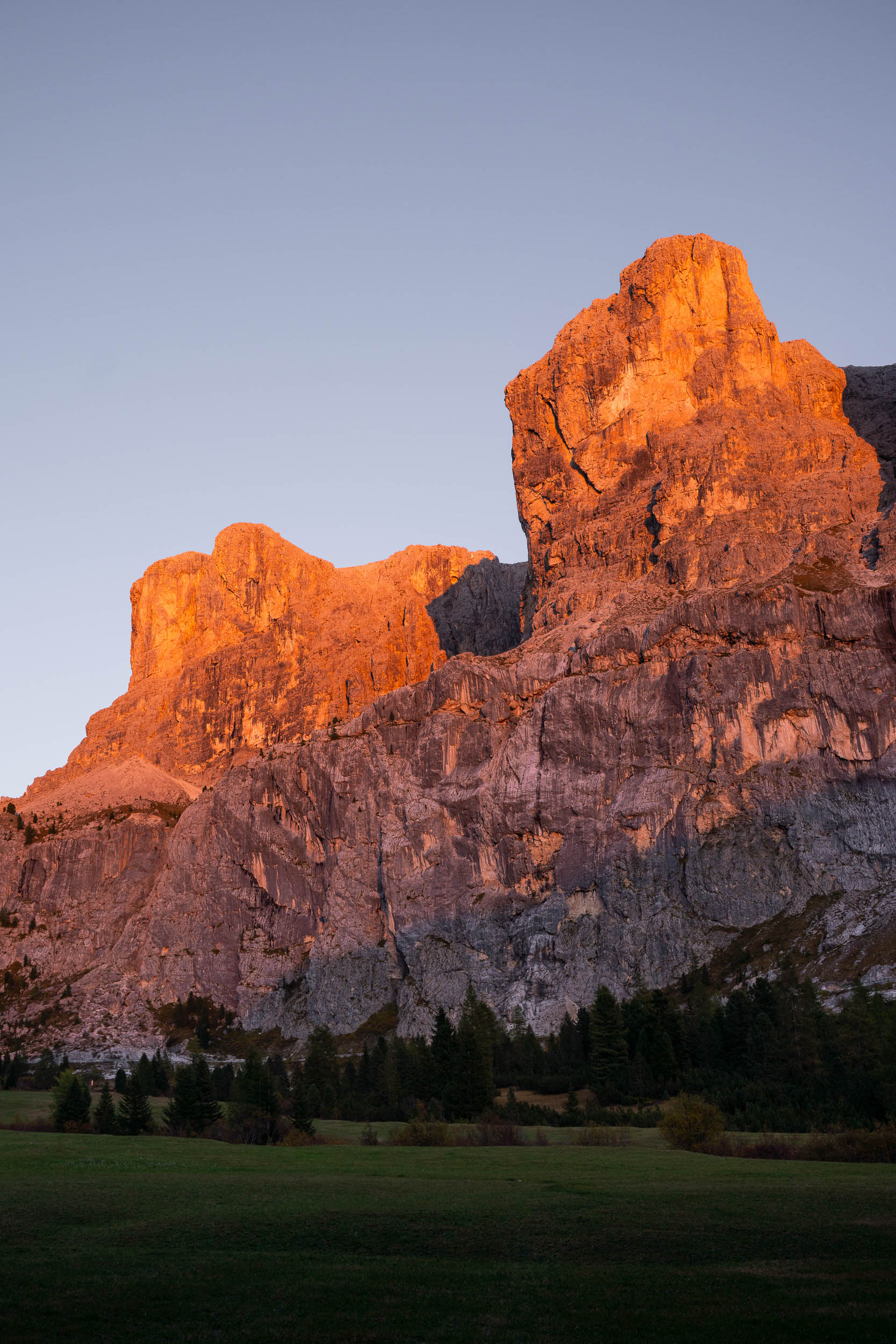 We arrived in Italy towards the end of September, just as summer was slowly fading and the scenery was turning from bright greens to vibrant yellow and orange. At that time of year, the larch trees begin to pop with bright golden yellow, and the leaves of other trees turn orange and drop to the ground, leaving an ever-evolving collage of colour along the trails. At sunrise and sunset, the mountain peaks are illuminated in bright pink tones as the unique mineral composition of the light-colored dolomite rock reflects and absorbs light. This magical display of colour is called Enrosadira, which translates to “turning pink” in ancient Ladin.