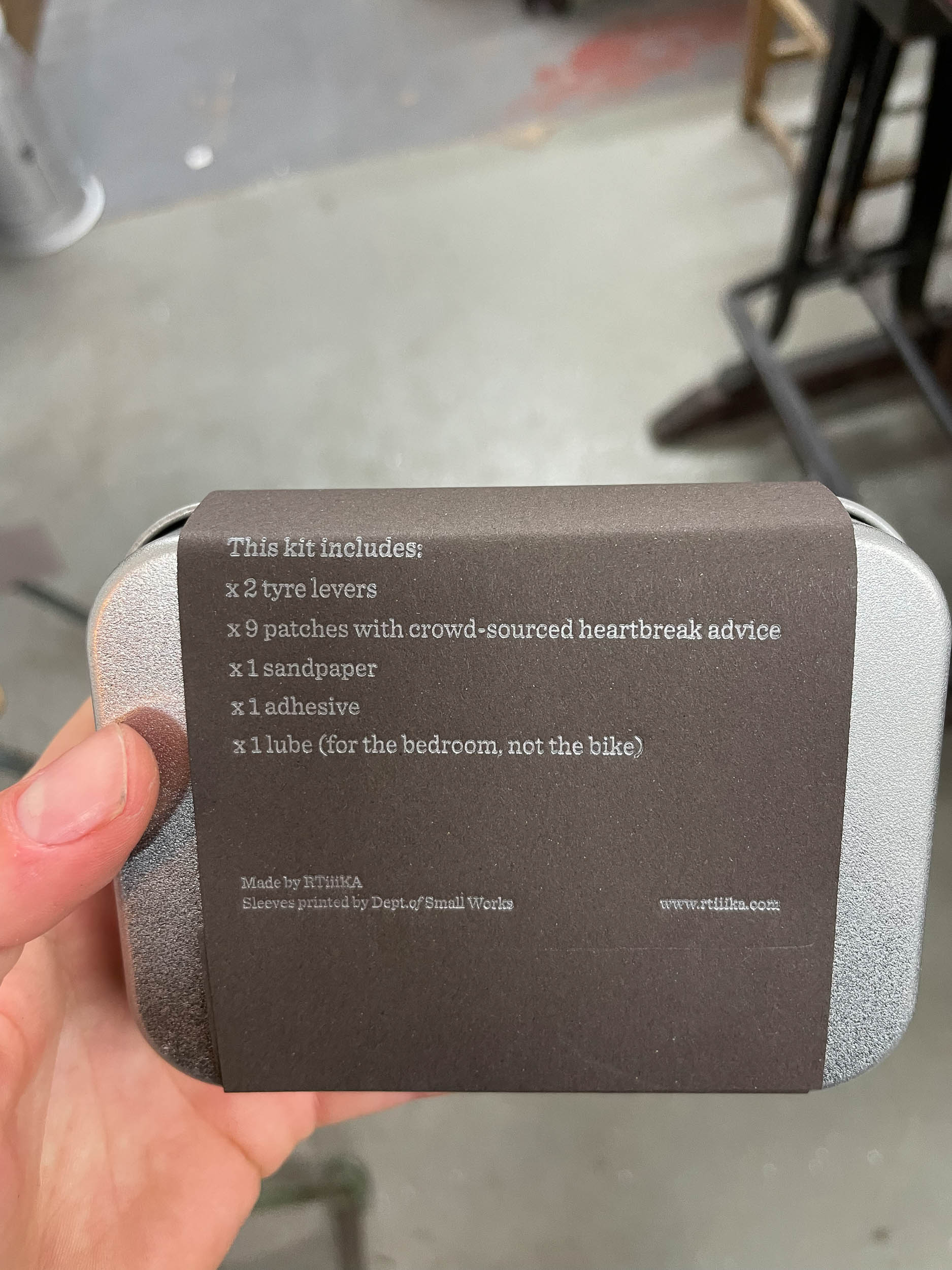 Following my own passions is also important to me. Like the Heartbreak Repair Kits I made, a practical kit for cyclists going through breakups. I asked 40 people what their advice on ways to heal a broken heart. I wrote their answers on puncture repair rubbers. I also added in lube sachets, which is not bike lube. The labels were printed on an old letterpress with the Department of Small Works.
