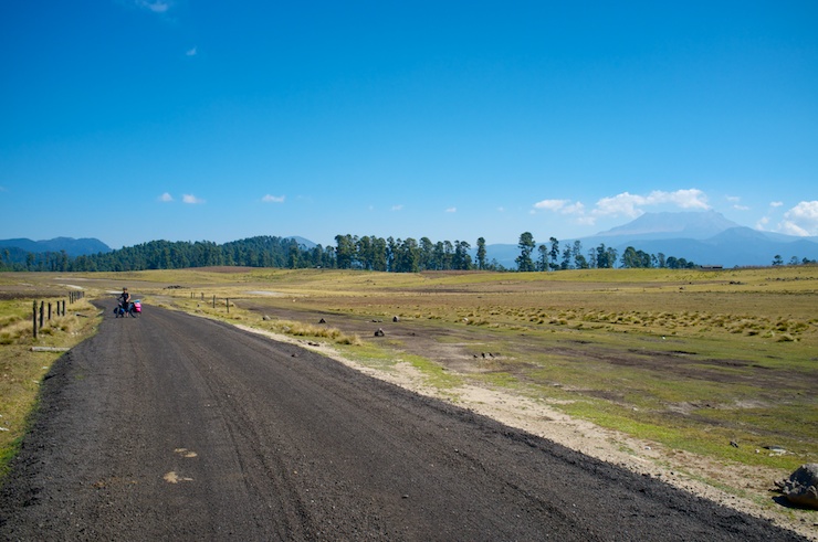 On Day one we started riding from Valle de Bravo on a nonstop climb through semi-populated areas where people were generally amused by our buxom touring rigs. Eventually the road gave way to beautiful farmland and pristine pine forests as we started nearing the national forest. We were in the shadow of Volcan de Nevado de Toluca. About 13 miles/2,200 feet later we went into a restaurant to ask someone for directions to a hotel or campamento (campground). We were bushed.